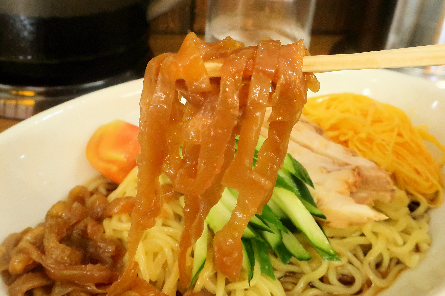 神奈川では珍しい東京製麺の中細麺、スープの温度に合わせて粗熱を取って温度帯を合わせています。