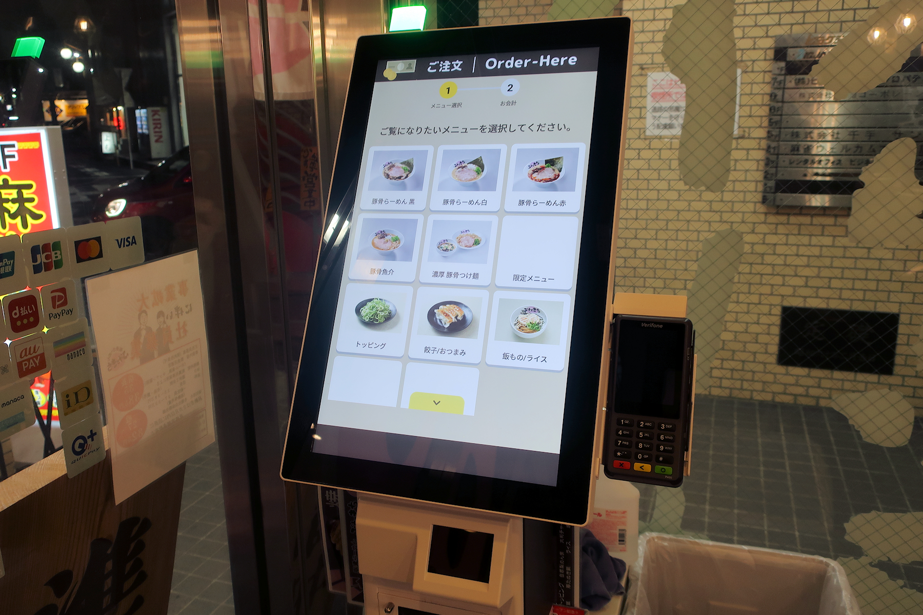 オーダーが終わって表示されるQRコードを券売機横で読み取らせて発券させたレシートを店員さんに渡します。