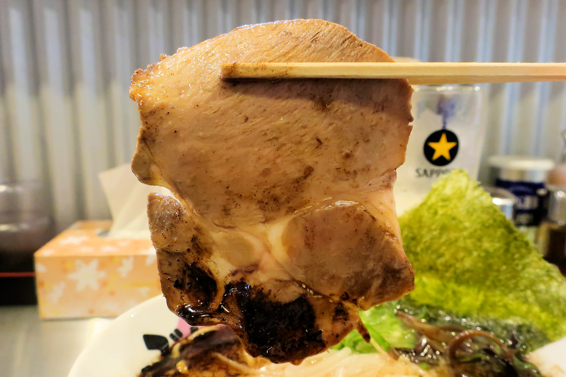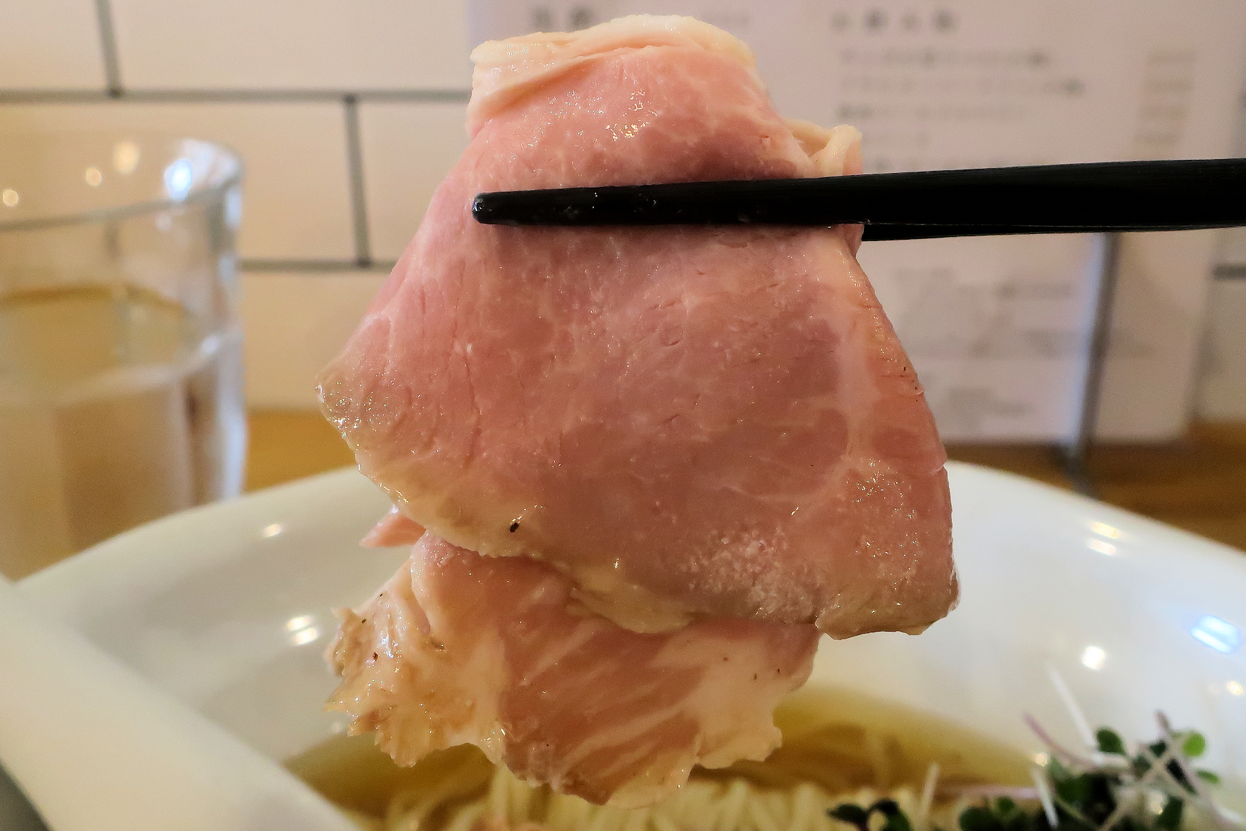 丿貫では見慣れた豚肩ロースのレアチャーシュー、花型に折りたたんで乗せてあるのが良いですね。