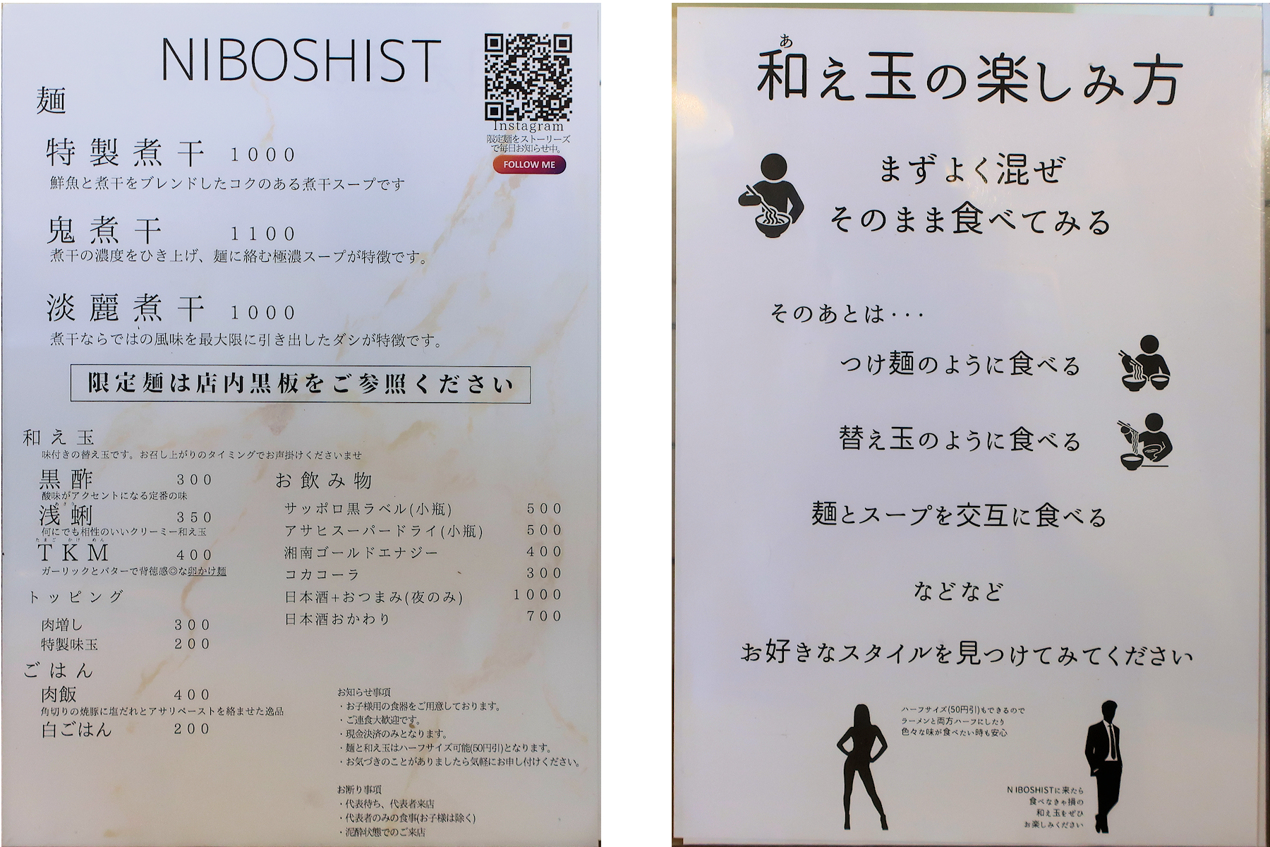 メニューは特製煮干1,000円、鬼煮干1,100円、端麗煮干1,000円。