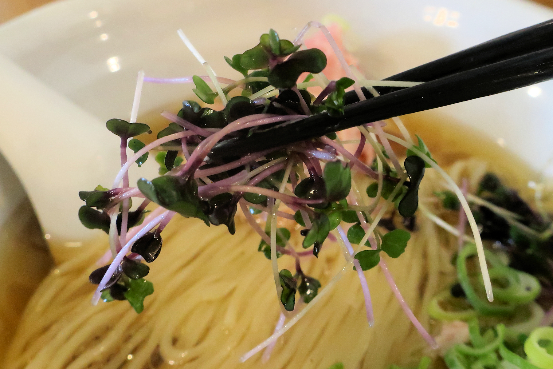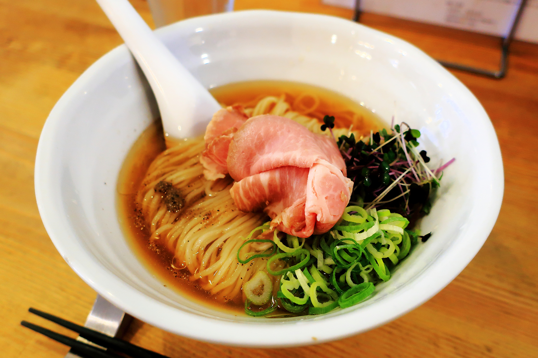 バシッとスープ、ビシッと麺、ドーンとレアチャーシューの麺相に薬味ネギとスプラウトがたっぷり。