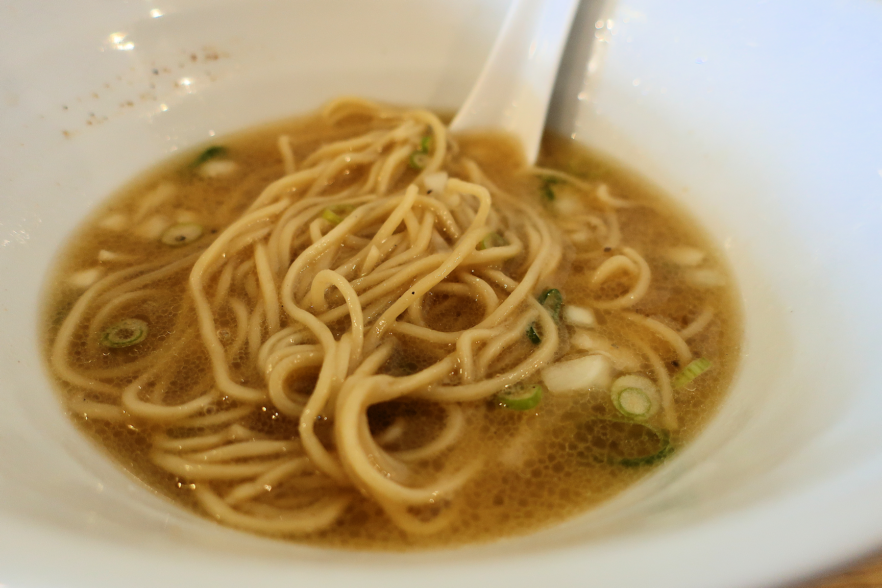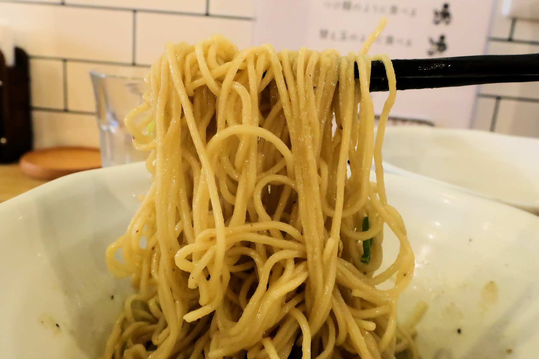 真鯛中心の淡麗スープの旨味を綺麗に受け止め、スルスルといつまでも啜りたいほどの美味しさ。