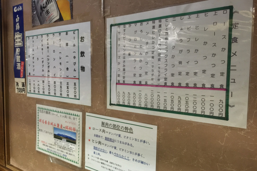 メニューはロースかつ定食スタートで、上ヒレまで300円の幅に収まっています。豚肉以外には海老、鶏とまぐろがあり、夜営業用に一品料理も揃っています。