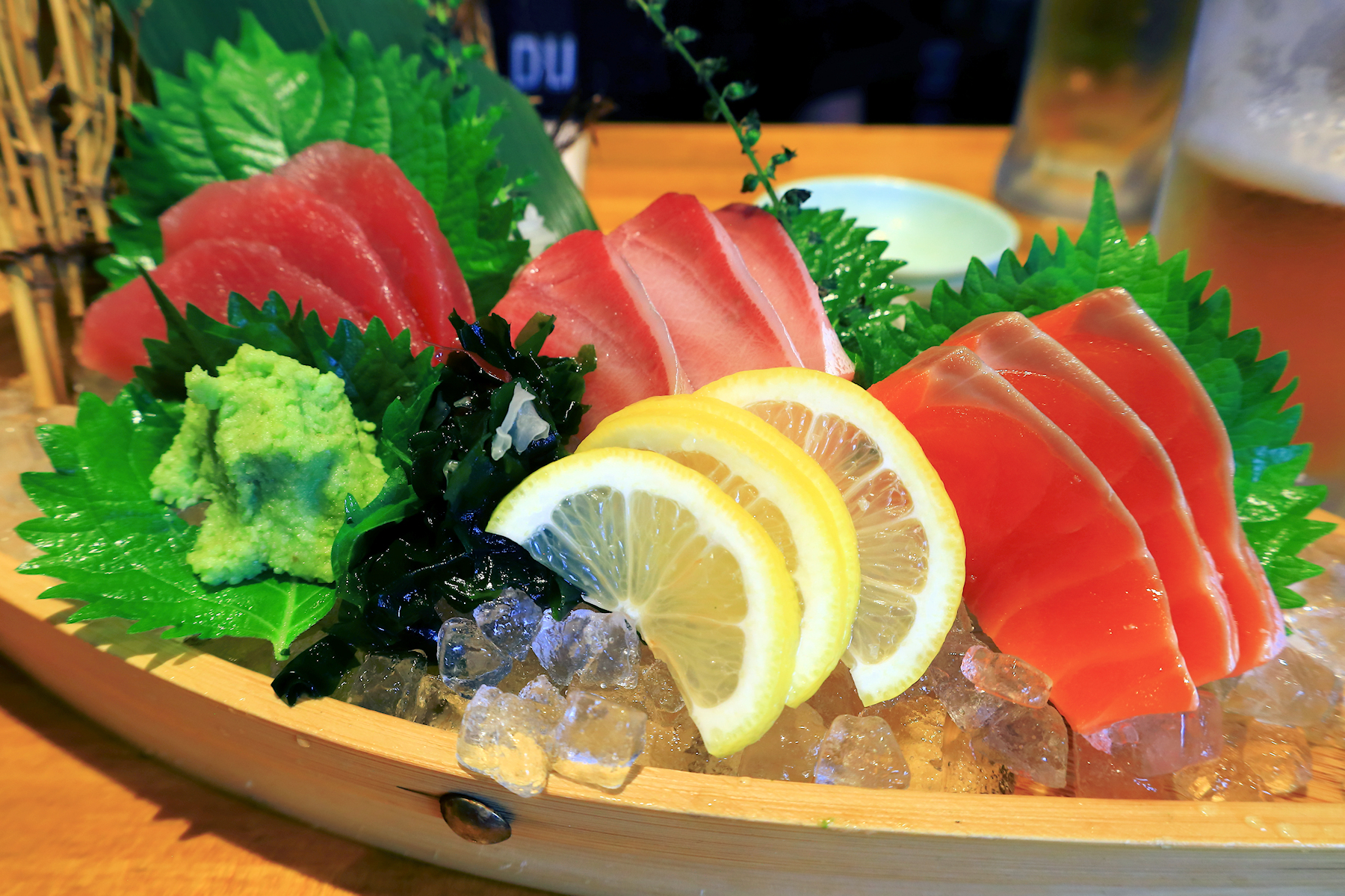 マグロ、ブリ、サーモンがそれぞれ3切れずつ、カットレモンも3枚。