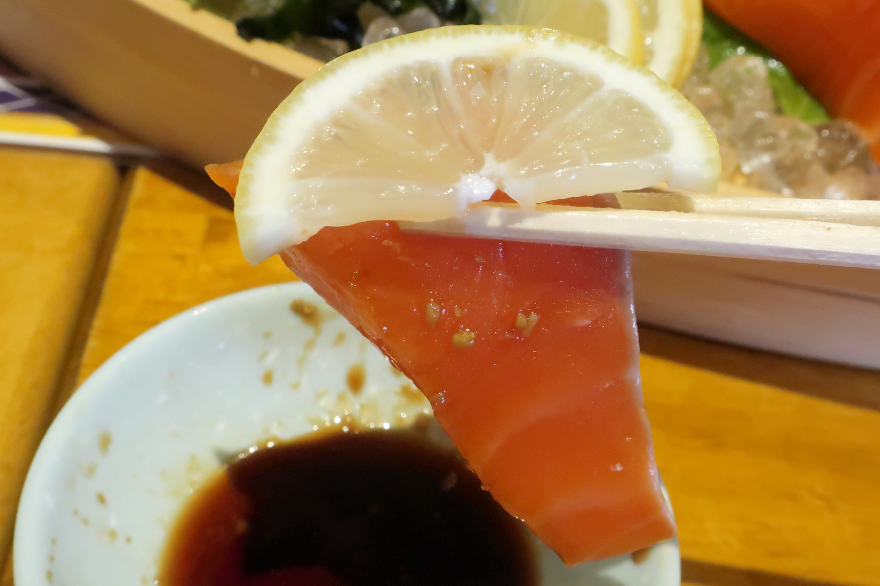 こういう食べ方は居酒屋ならではだと思っていて、酸味を利かせたサーモンも美味しい。