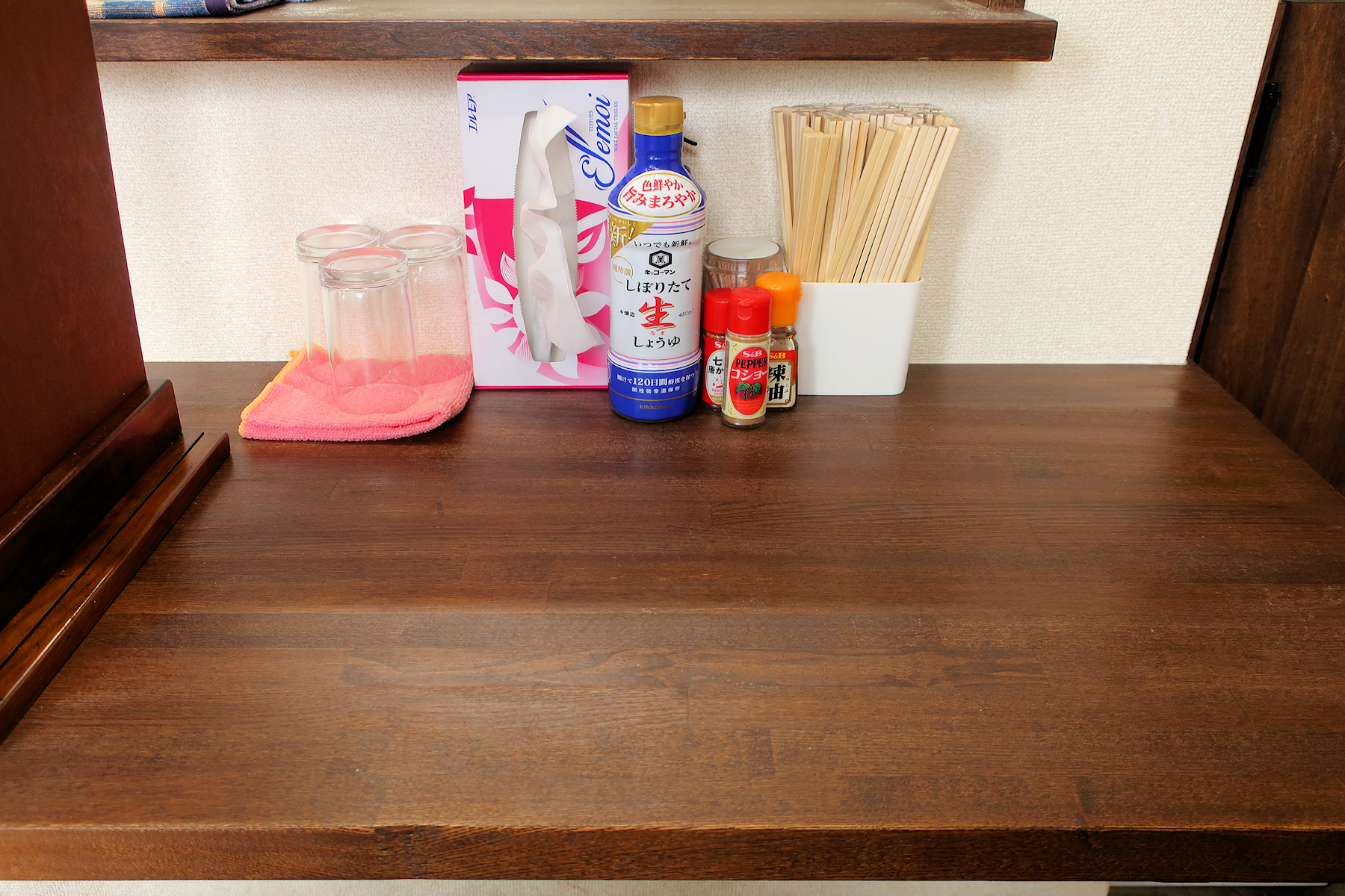卓上には醤油、酢、七味唐からし、辣油、コショー。