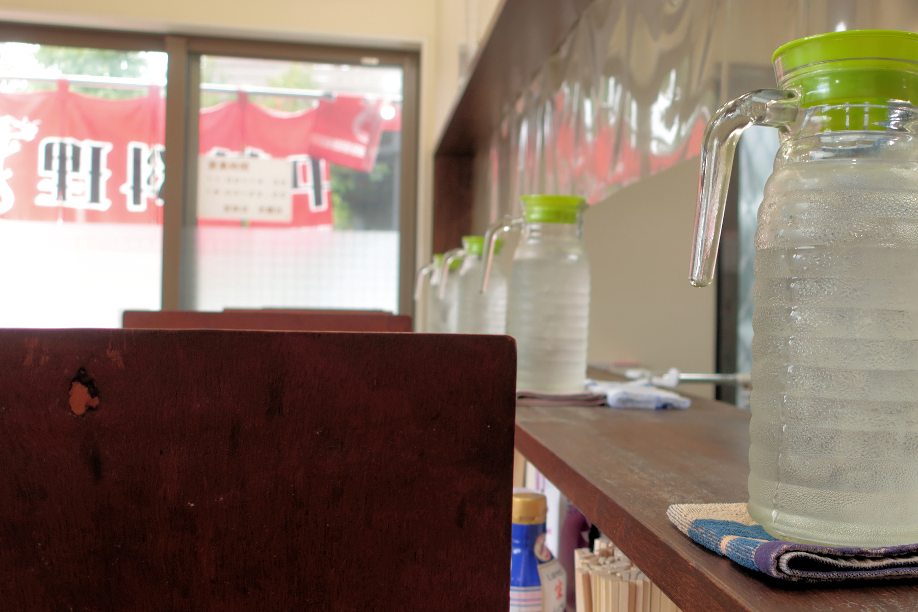 ピッチャーは席と席の間のカウンター台に置かれていて、取っ手が全て客席を向いています。