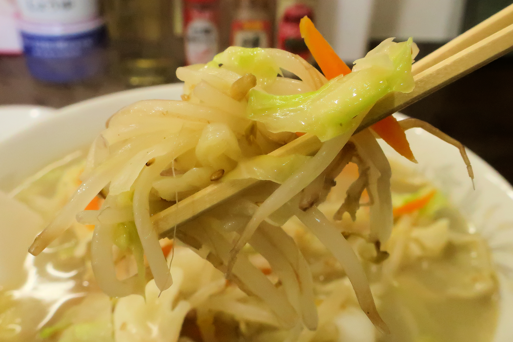 先ずは野菜から、モヤシ、キャベツ、ニンジン、キクラゲなど。