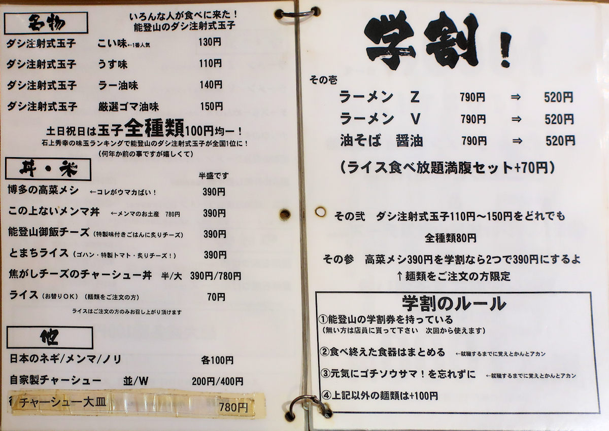 メニューをめくって1ページ目に油そば醤油長後本店味790円、中盛り無料サービス。