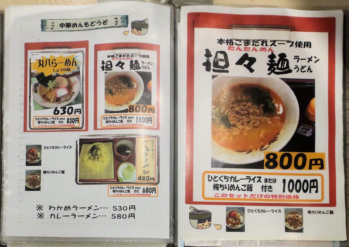 ラーメンはしょうゆ味、担々麺、ざるラーメン、わかめラーメン、カレーラーメン。