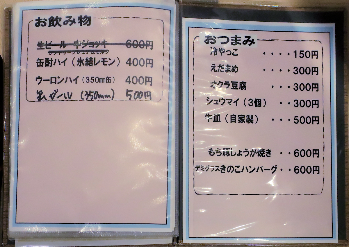 おつまみは冷やっこ、えだまめなどに加え、しょうが焼きやハンバーグの単品も。