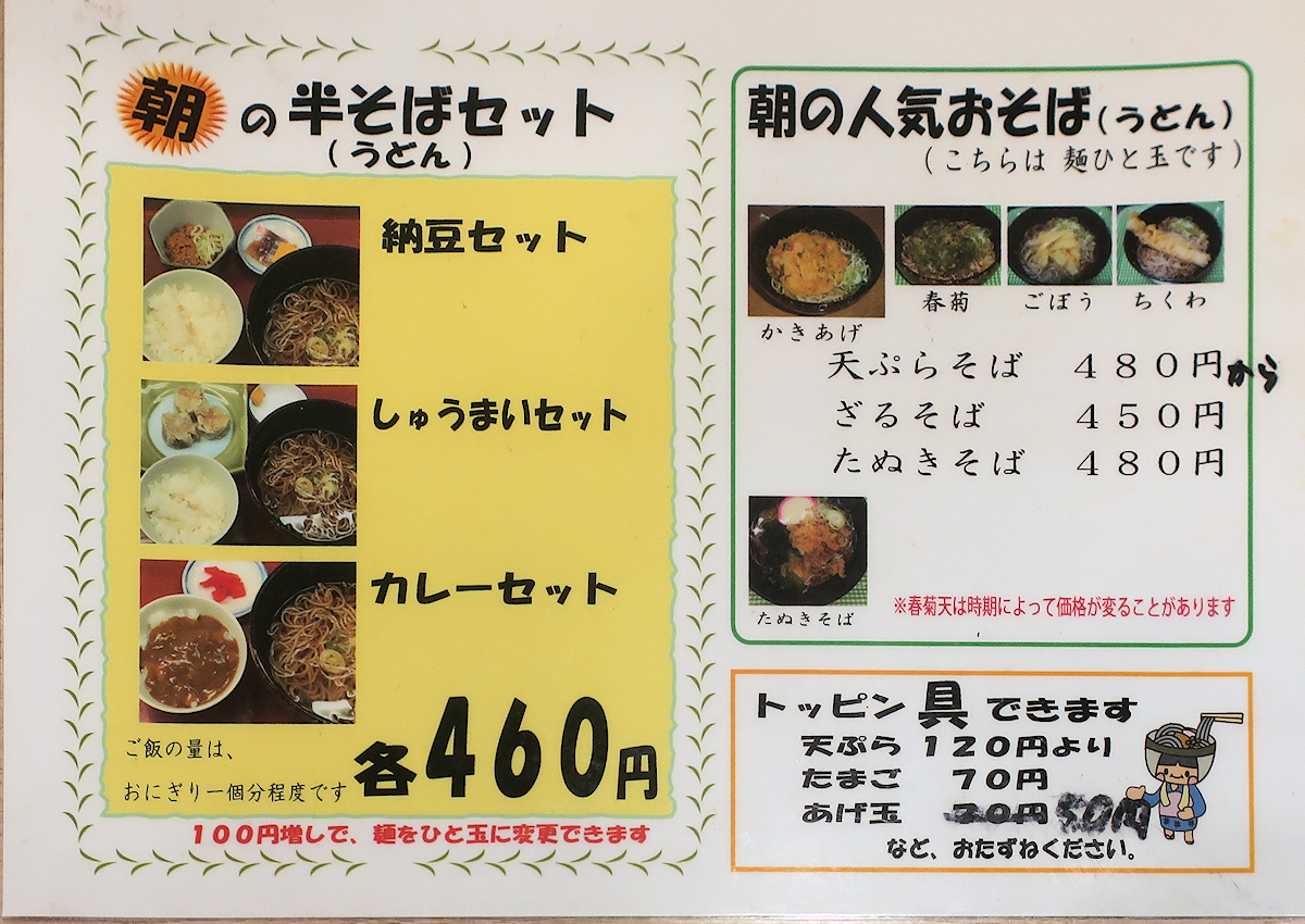 モーニングは、朝の半そば(うどん)セット460円。