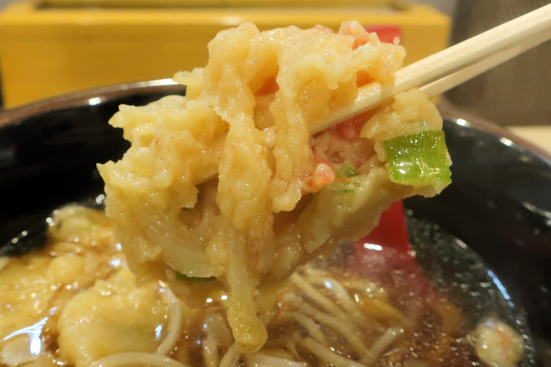 かき揚げはそばつゆをたっぷり吸って柔らかい味わい。