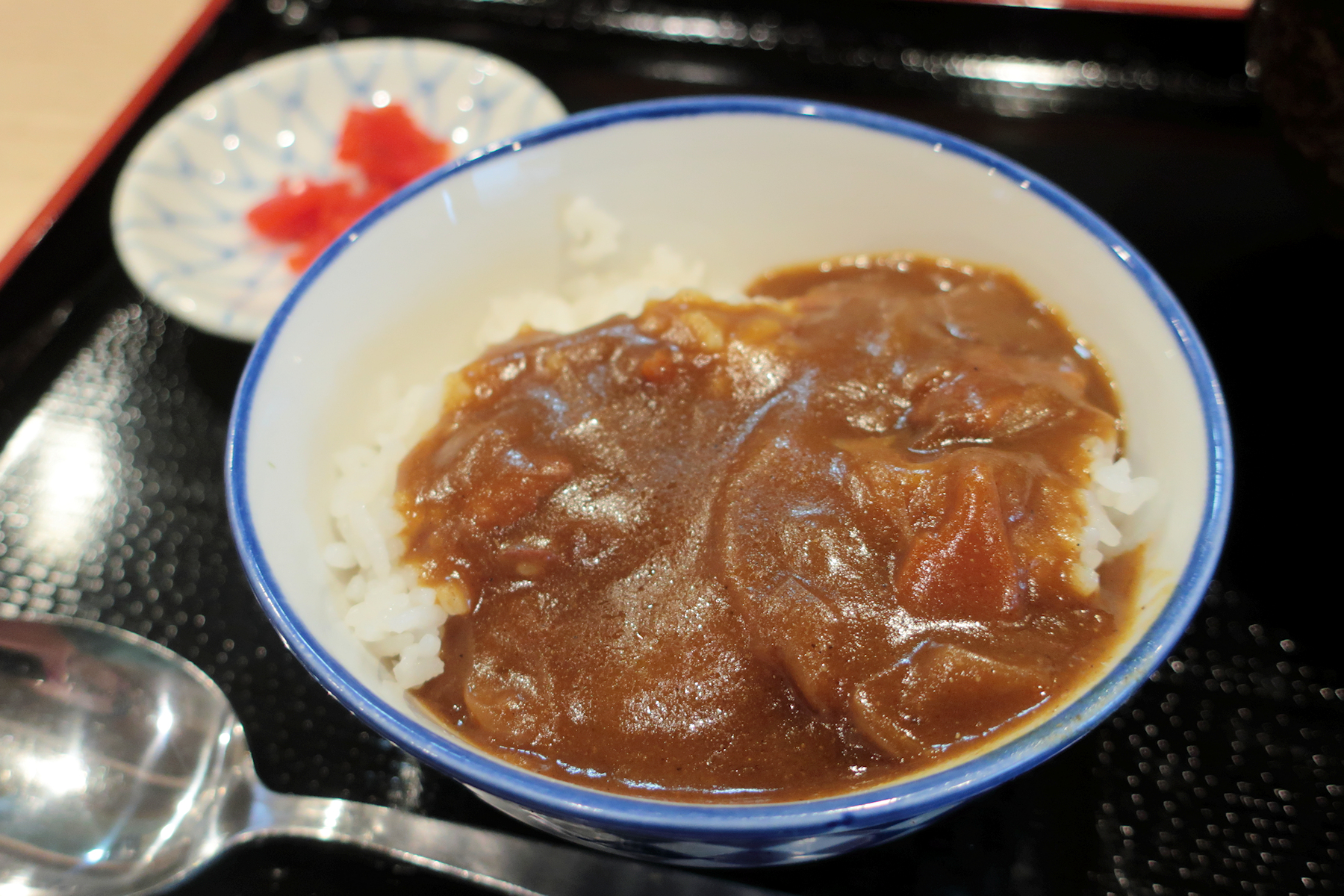 セットのカレーはおにぎり一個分のご飯に半分ほどのカレー、福神漬け付き。