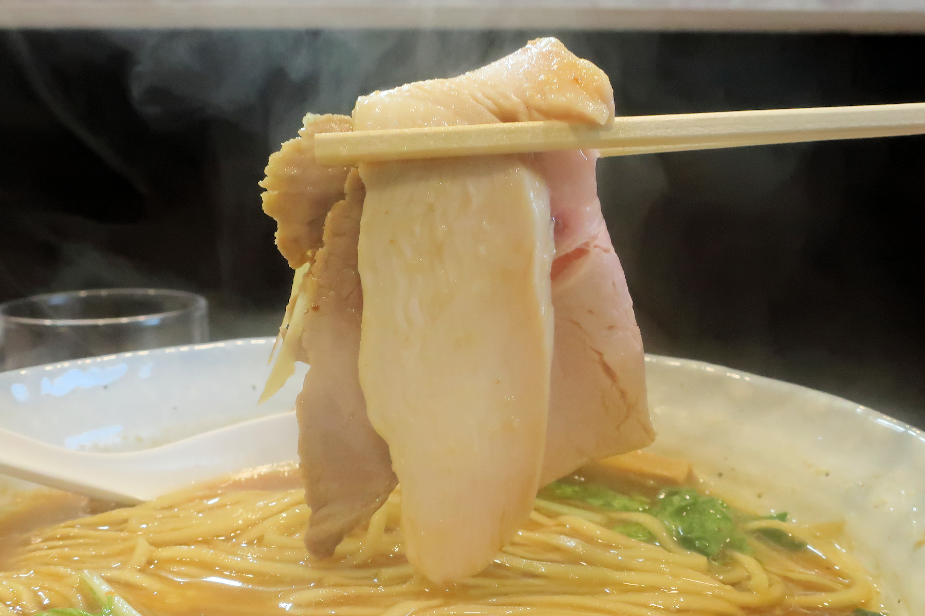 チャーシューは豚肩ロースと鶏もも肉の2枚構成、折りたたまれての盛り付けは流石。