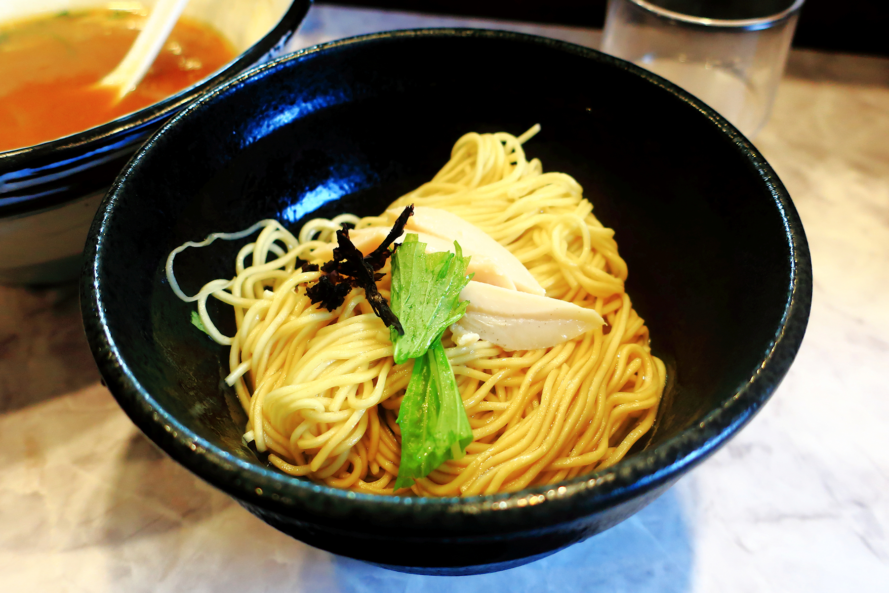 たれに絡めていない麺の上には鶏チャーシュー、水菜、海苔かな。
