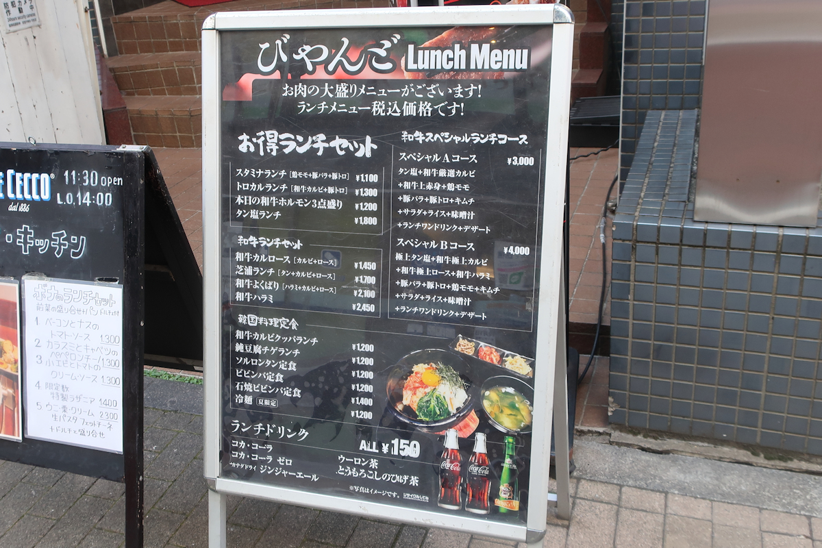韓国料理定食は和牛カルビクッパランチ、純豆腐チゲランチ、ソルロンタン定食、ビビンバ定食、冷麺〔夏限定)が1200円。石焼ビビンバ定食1,400円。