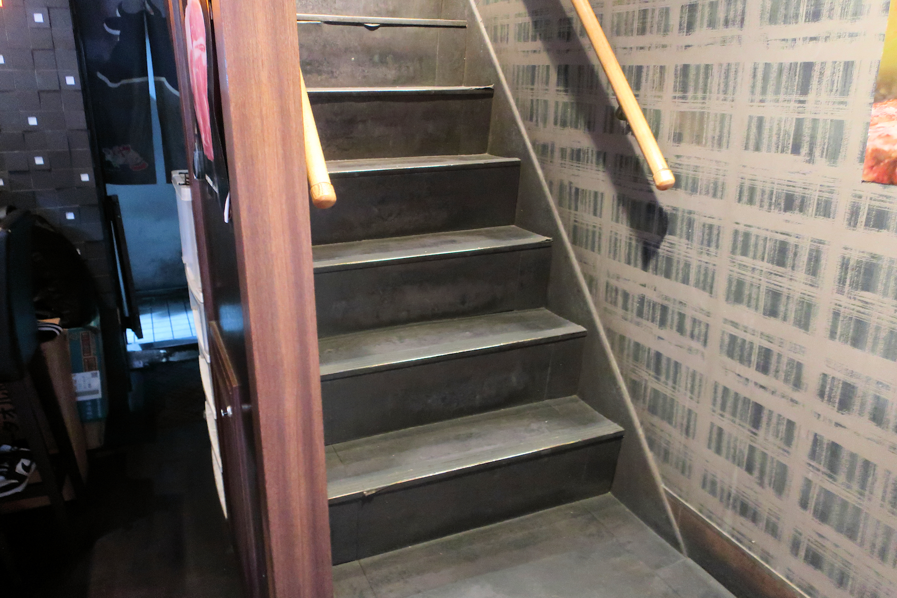 美味しい焼肉を食べて、美味しいお酒を飲んだら、この急な階段の危険が危なそう。
