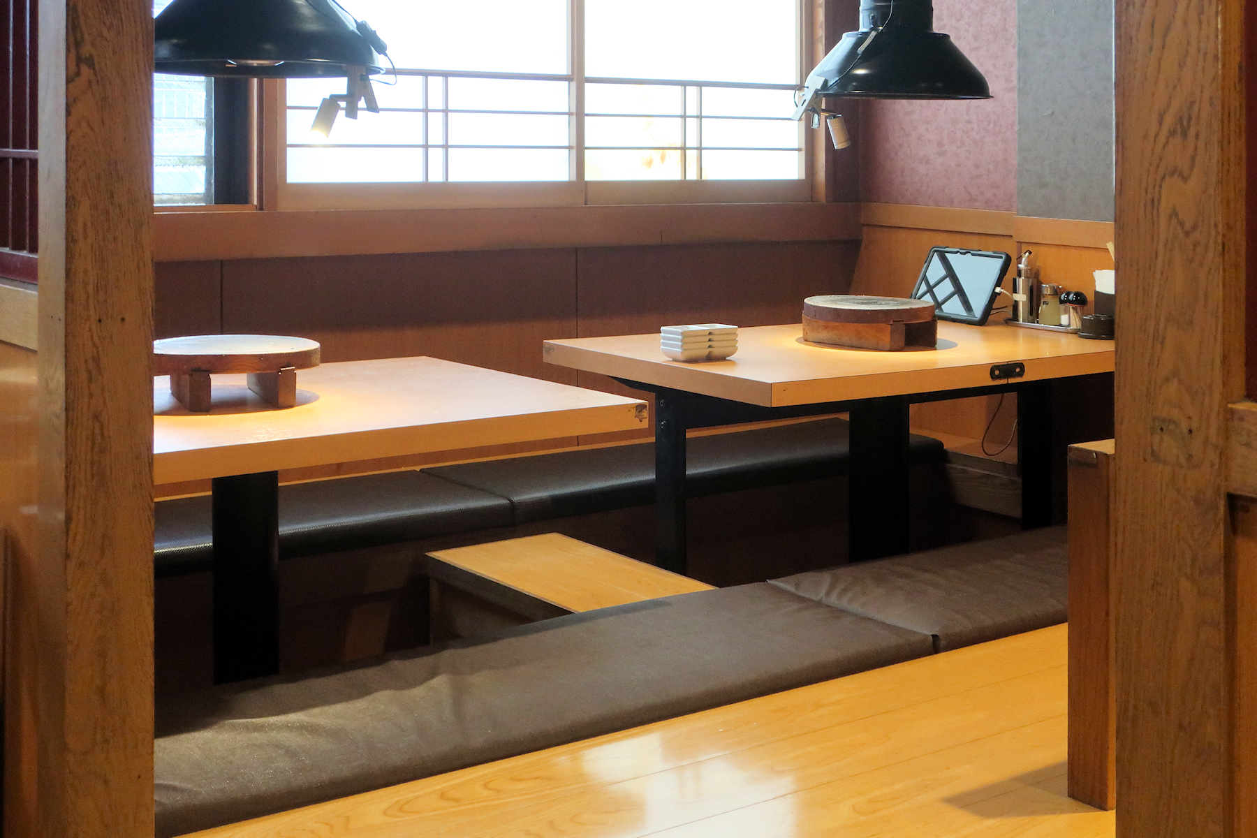 階段の周りにテーブル席と座敷席が用意されて、座敷席は全て掘りごたつ式。