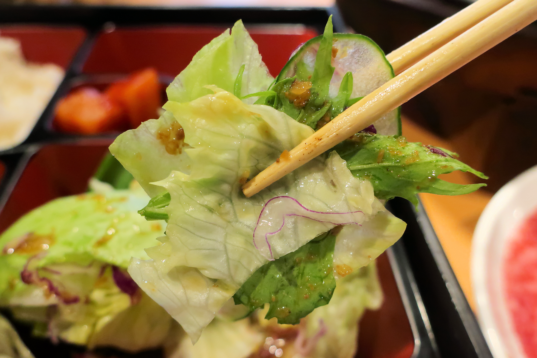 濃いめに味付けされたドレッシングが掛けられたレタス、たっぷり。