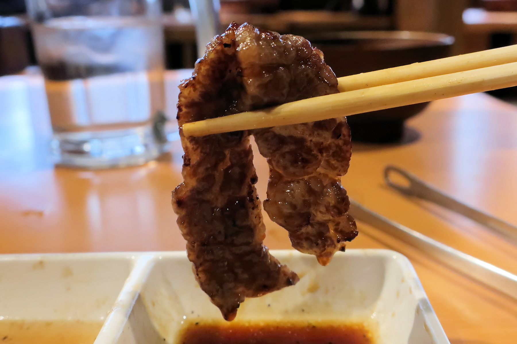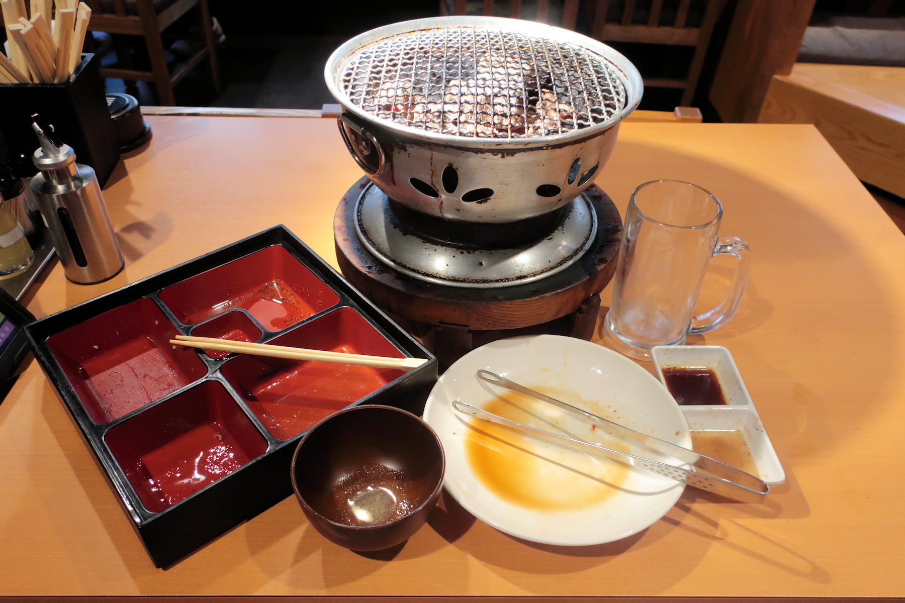 卓上には焼肉のたれ、レモン汁、塩が用意されています。