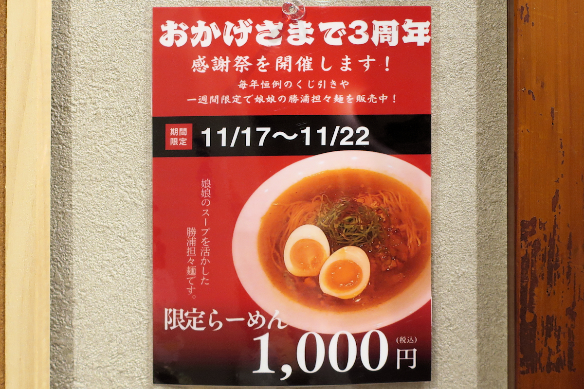 ちなみに、限定メニューは『娘娘のスープを活かした勝浦担々麺』とのこと。