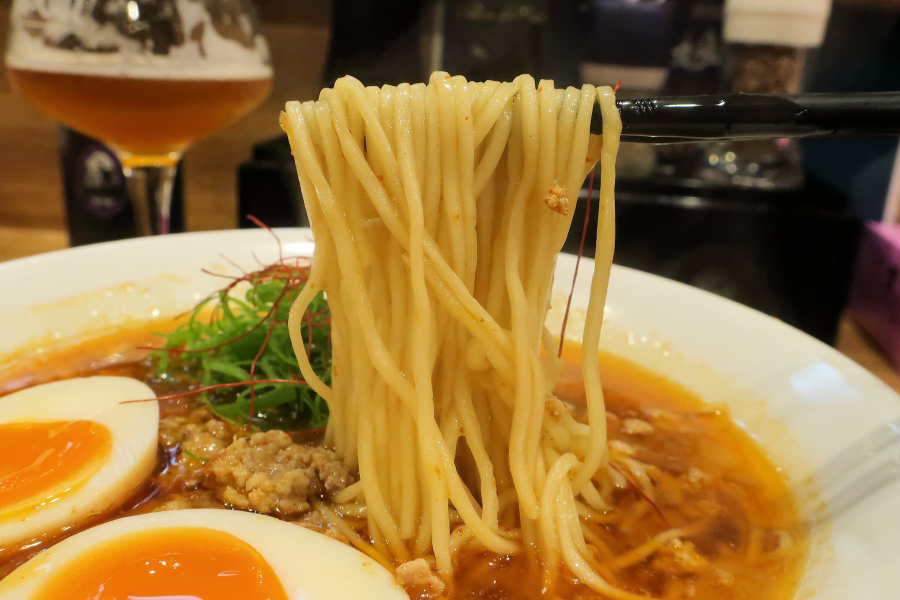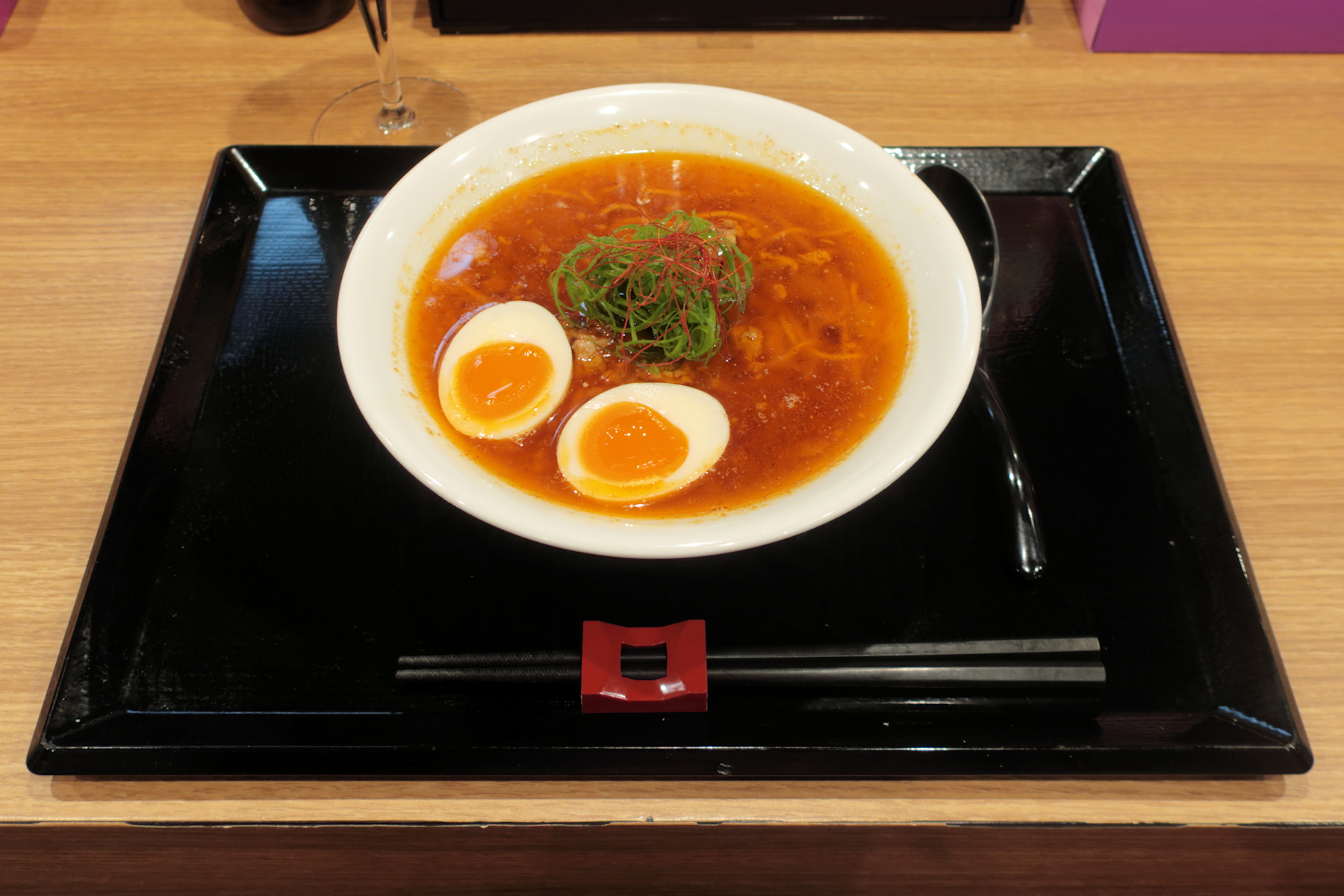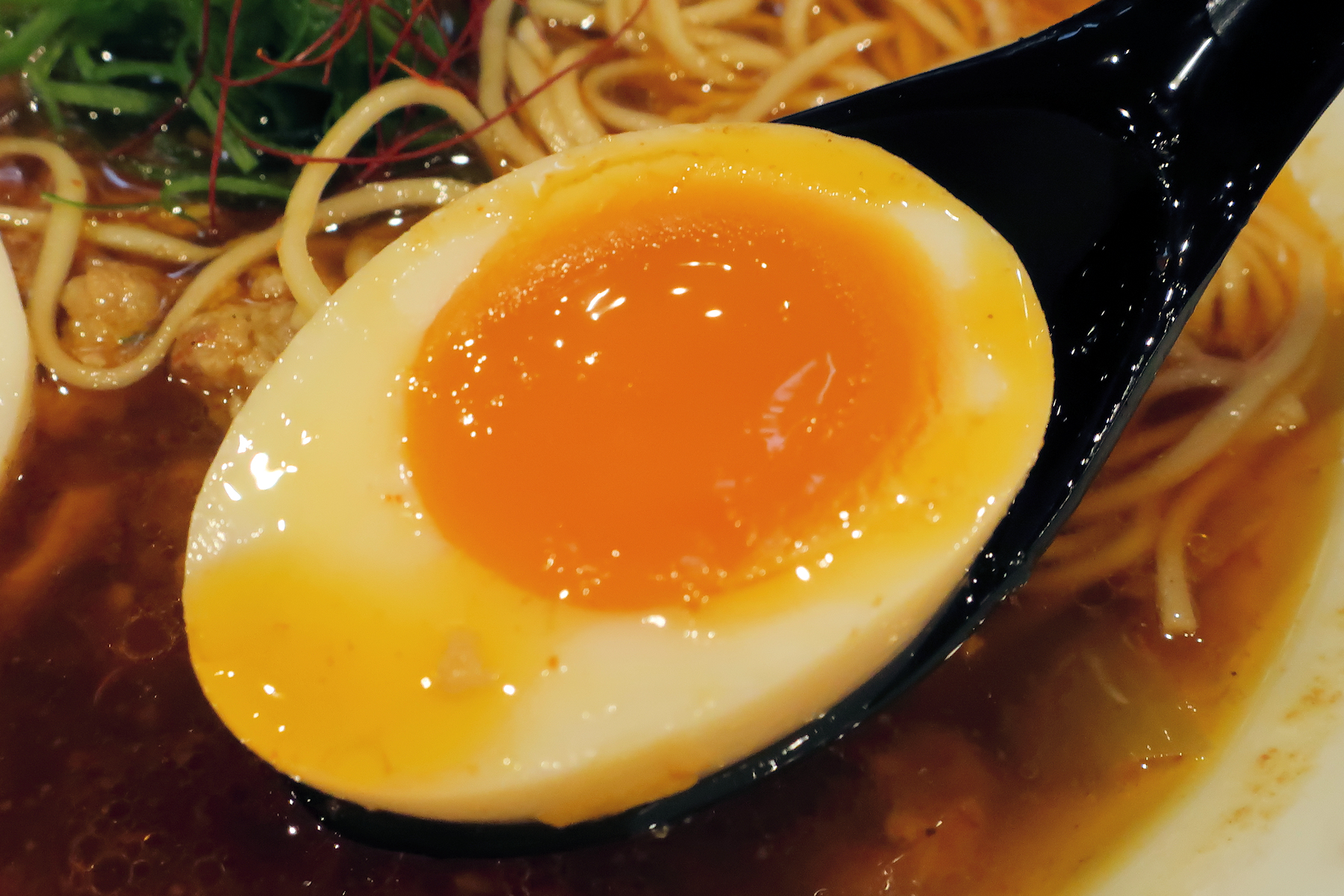 カツタン(勝浦担々麺)らしからぬ味玉、ネギ、糸唐辛子のトッピング。