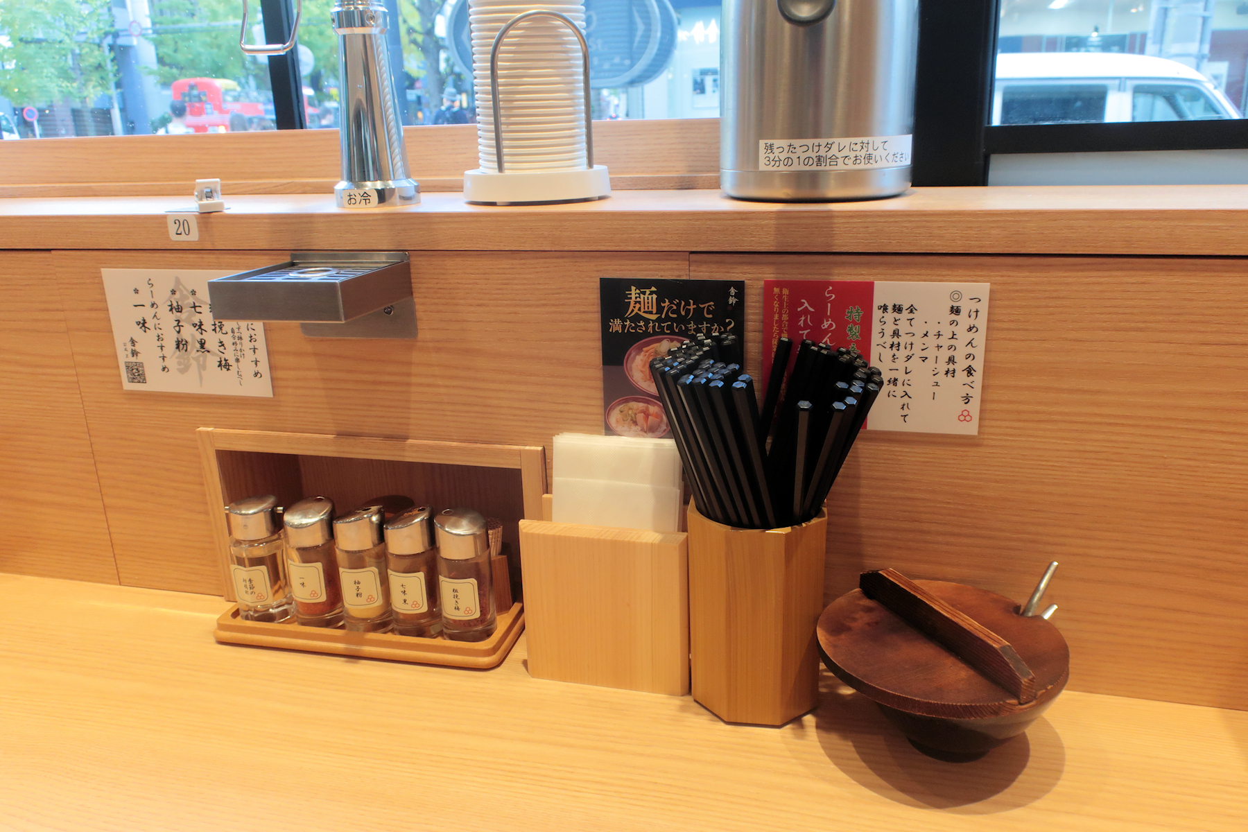 卓上には粗挽き梅、七味黒、柚子粉、一味、季節の柑橘酢、特製辛味。