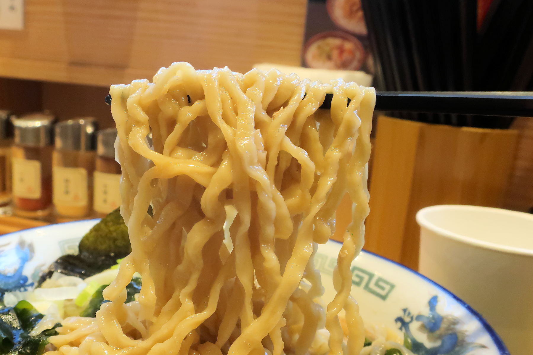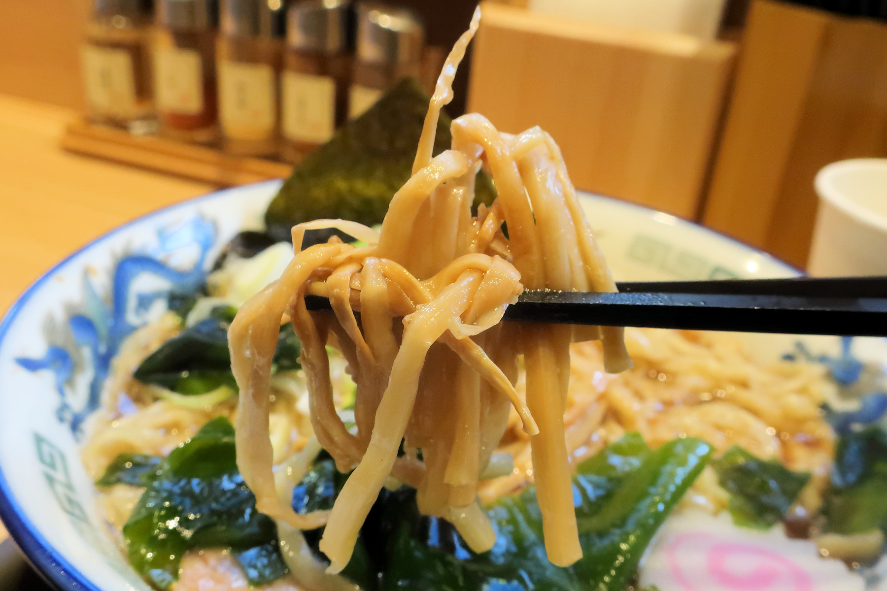 合わせる自社製麺は縮れ平打太麺、特徴的であり、独特の食感を楽しめます。