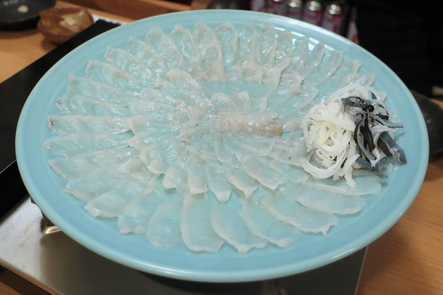 すぐに用意されたのがとらふぐ刺身、いわゆるてっさ。