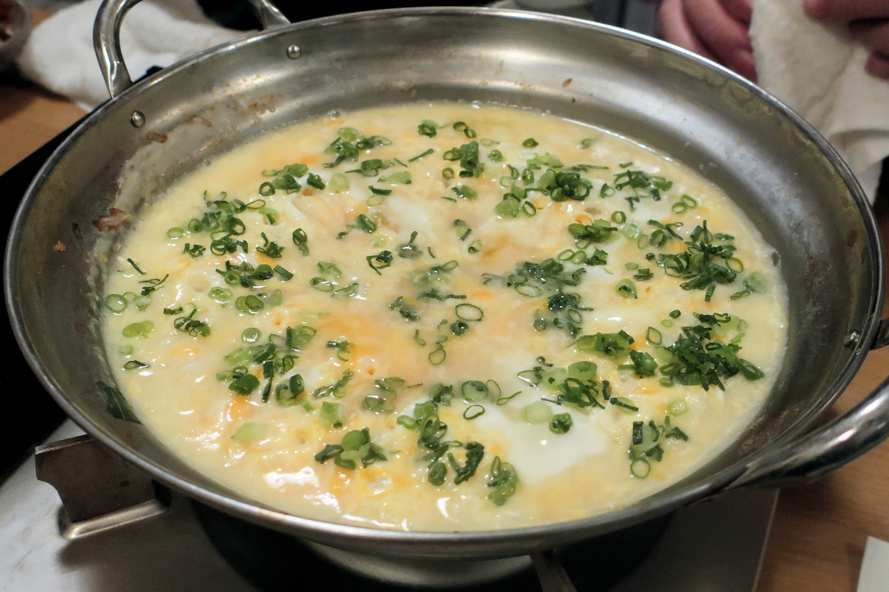 たまごでとじて、ネギを散らして出来上がり。