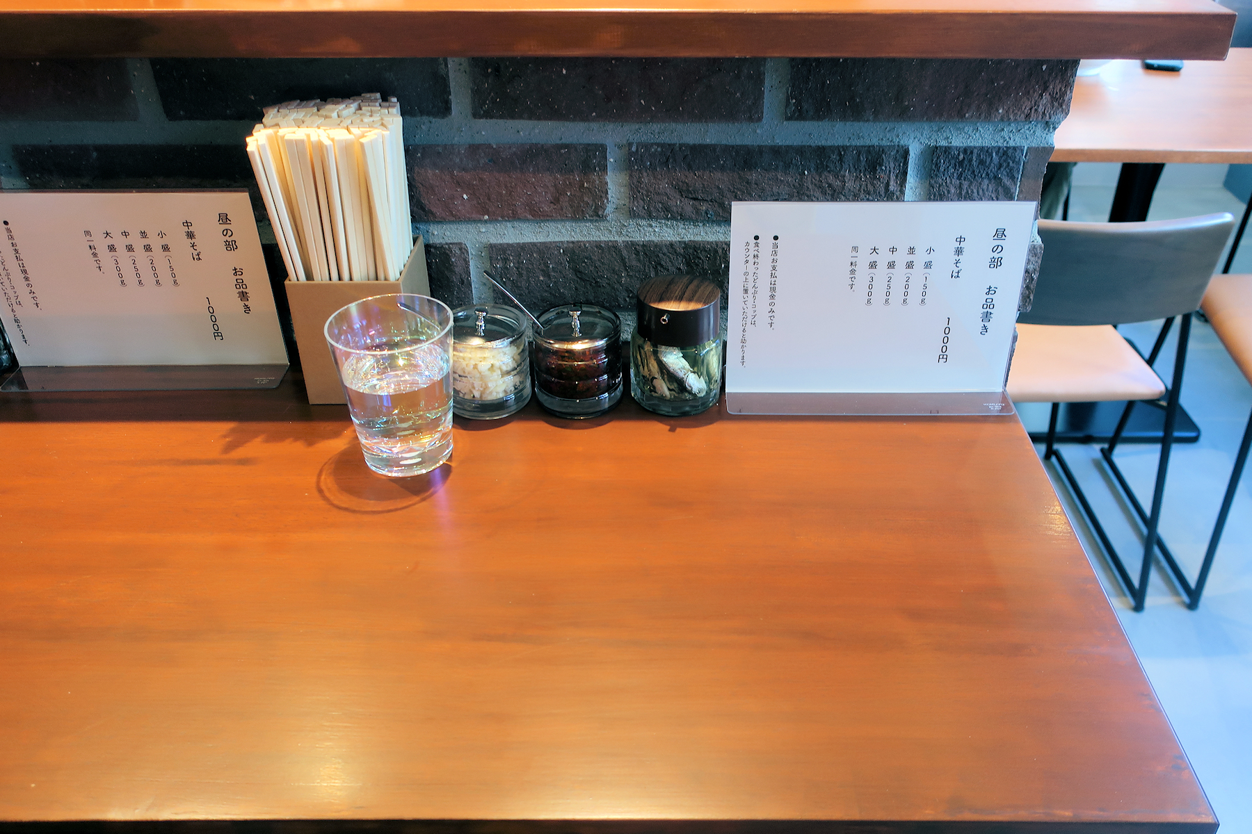 メニューは中華そば1,000円のみのストロングスタイル、有料トッピングは用意されていません。