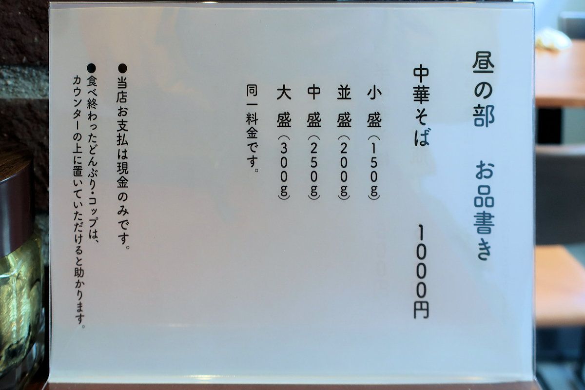 麺量は小盛(150g)、並盛(200g)、中盛(250g)、大盛(300g)から選べて、同額です。