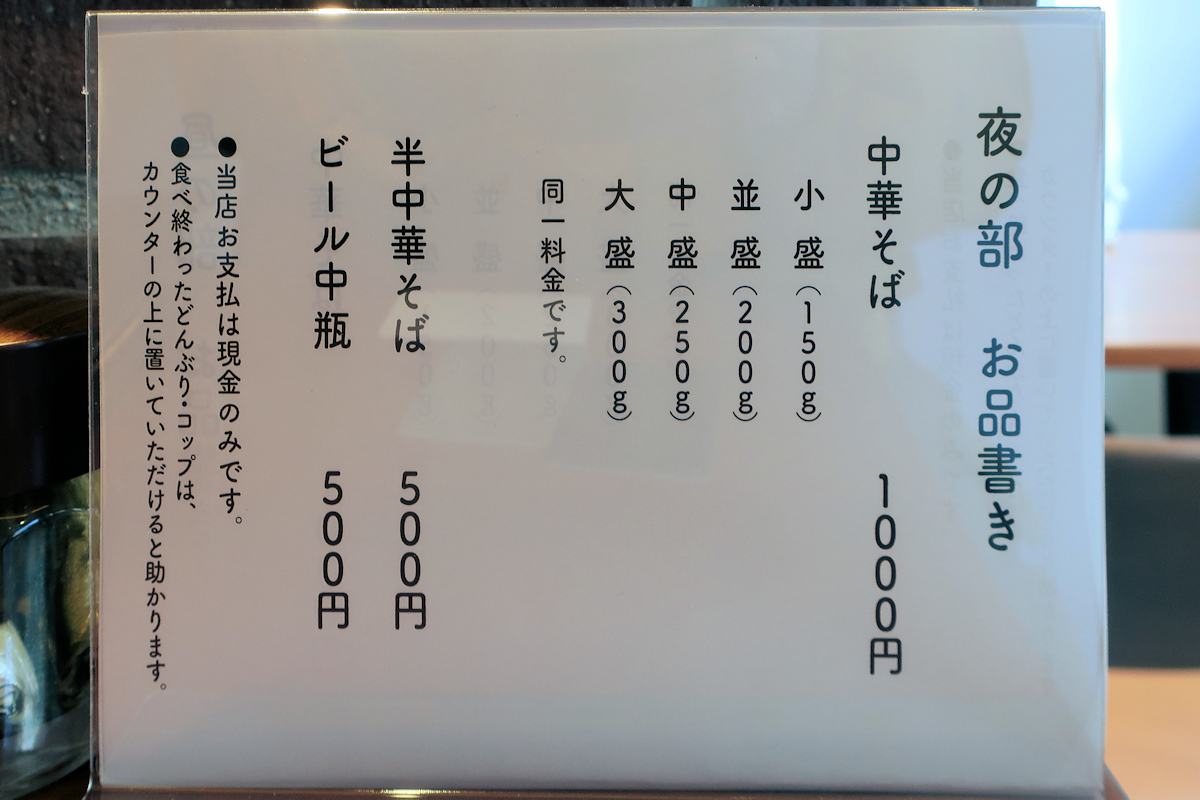 夜営業では、半中華そば500円、ビール中瓶500円が追加されます。