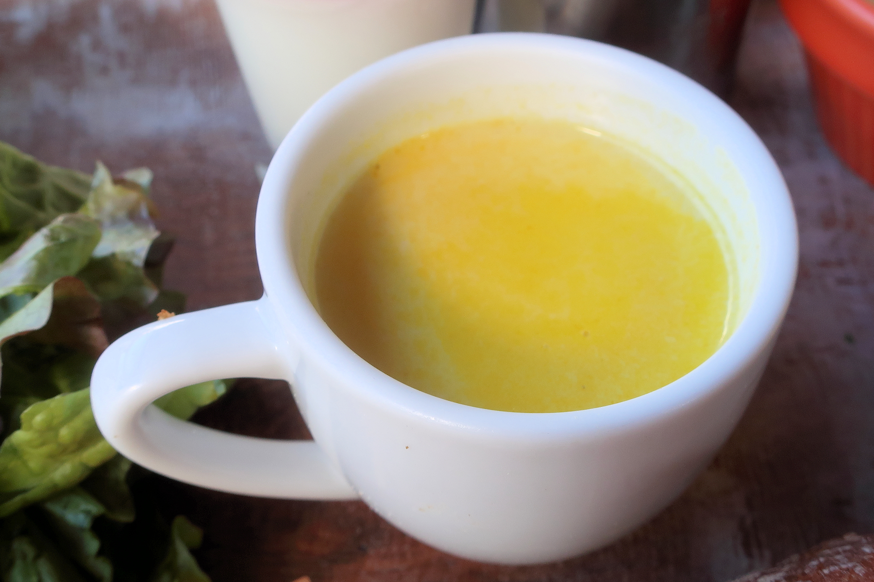 先ずはスープ、とうもろこしとさつま芋のスープ。