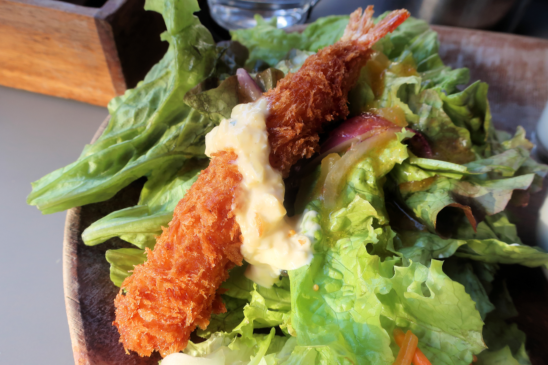 グリーンサラダ、海老フライと具沢山のタルタル。