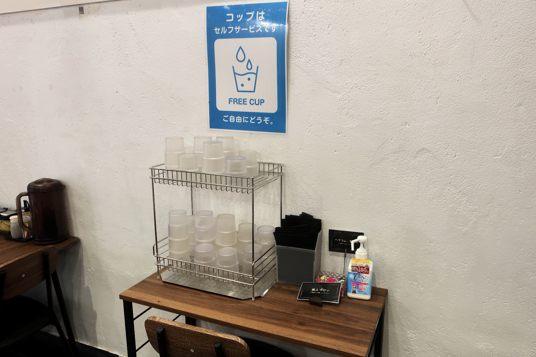 閑話休題、店内中央のコップ置きからコップと紙エプロンを取って、端っこのテーブルに座ります。