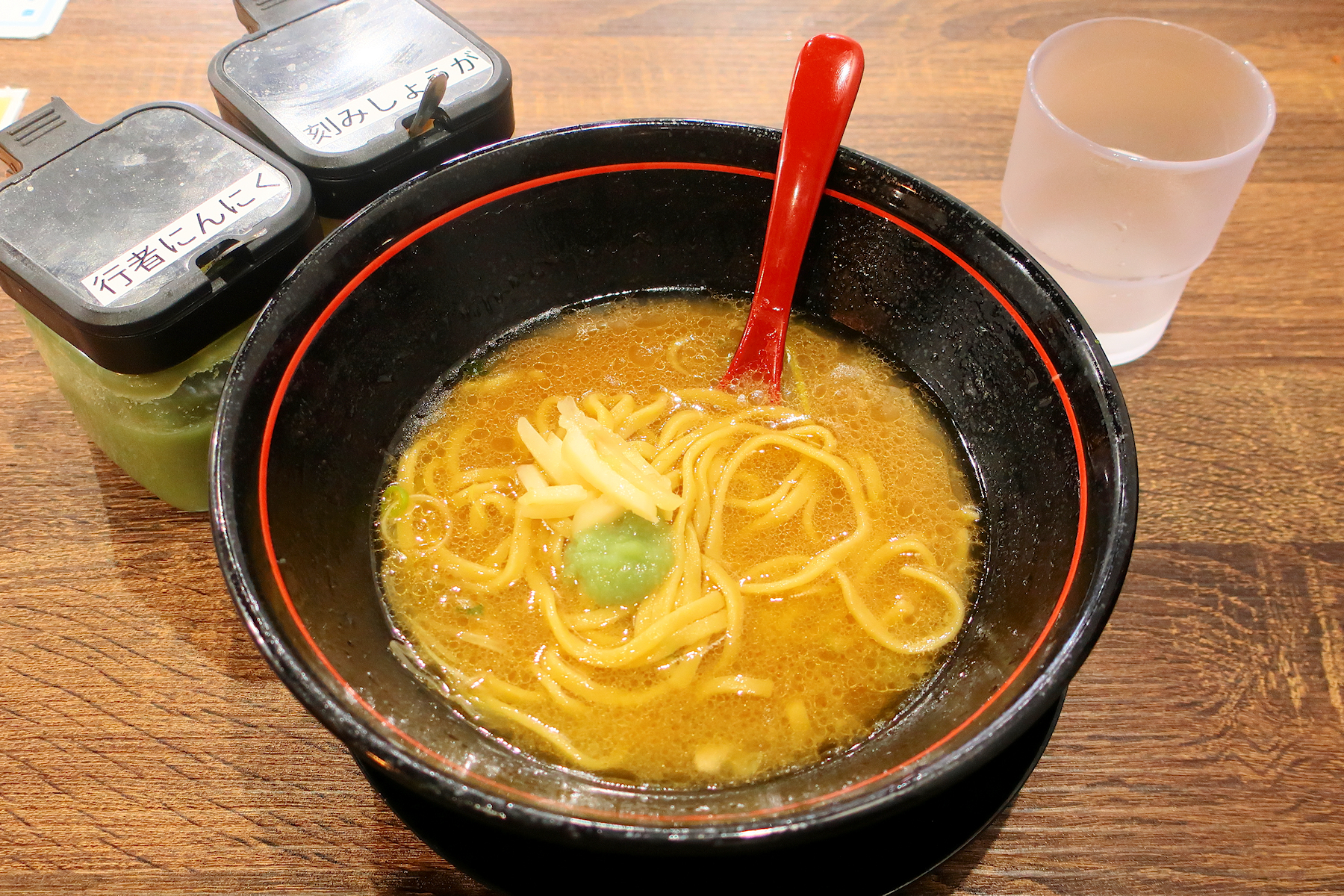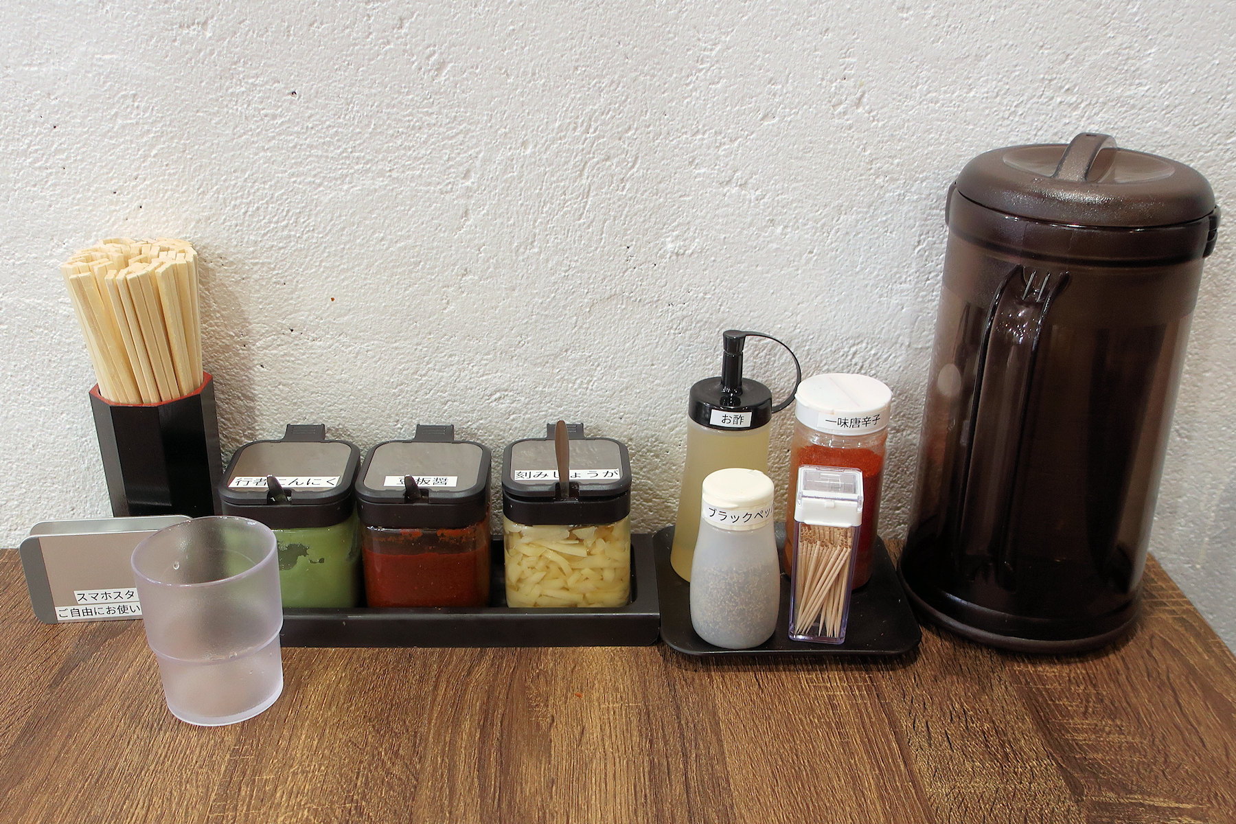 卓上には、行者にんにく、豆板醤、刻みしょうが、ブラックペッパー、お酢、一味唐辛子。