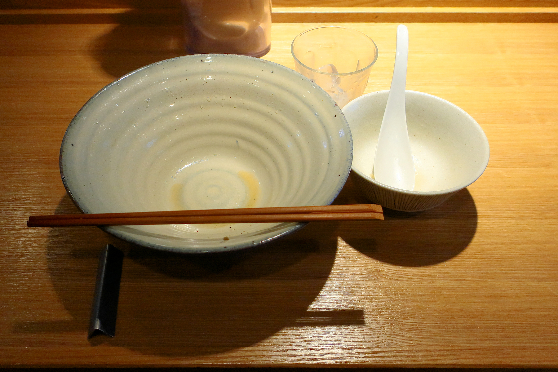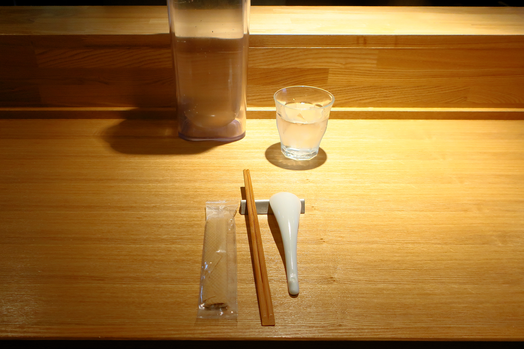 箸置きに箸とレンゲが置かれているけど、何故に縦置きなのだろうか。
