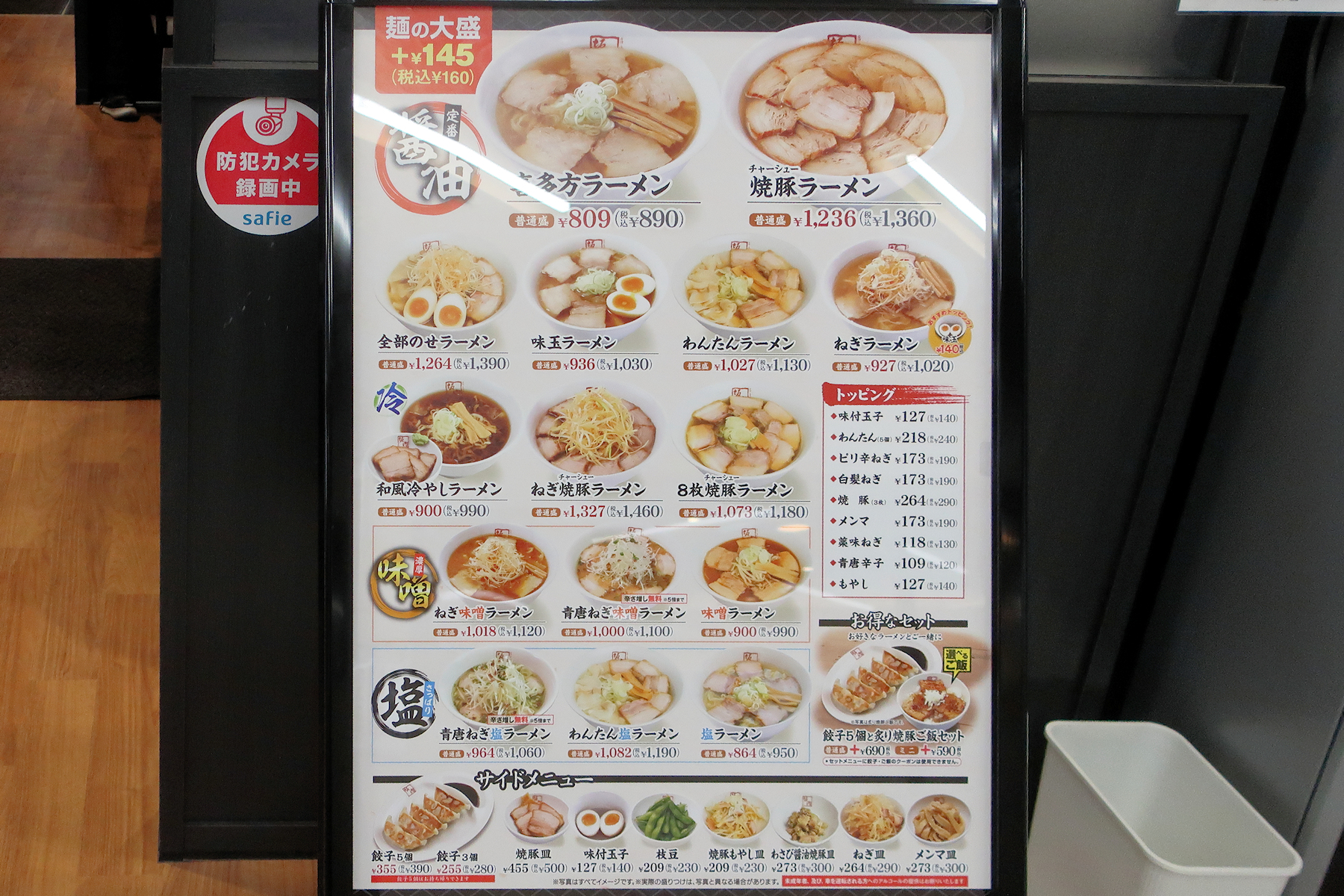メニューは喜多方ラーメン890円、和風冷やしラーメン990円、味噌ラーメン990円、塩ラーメン950円。