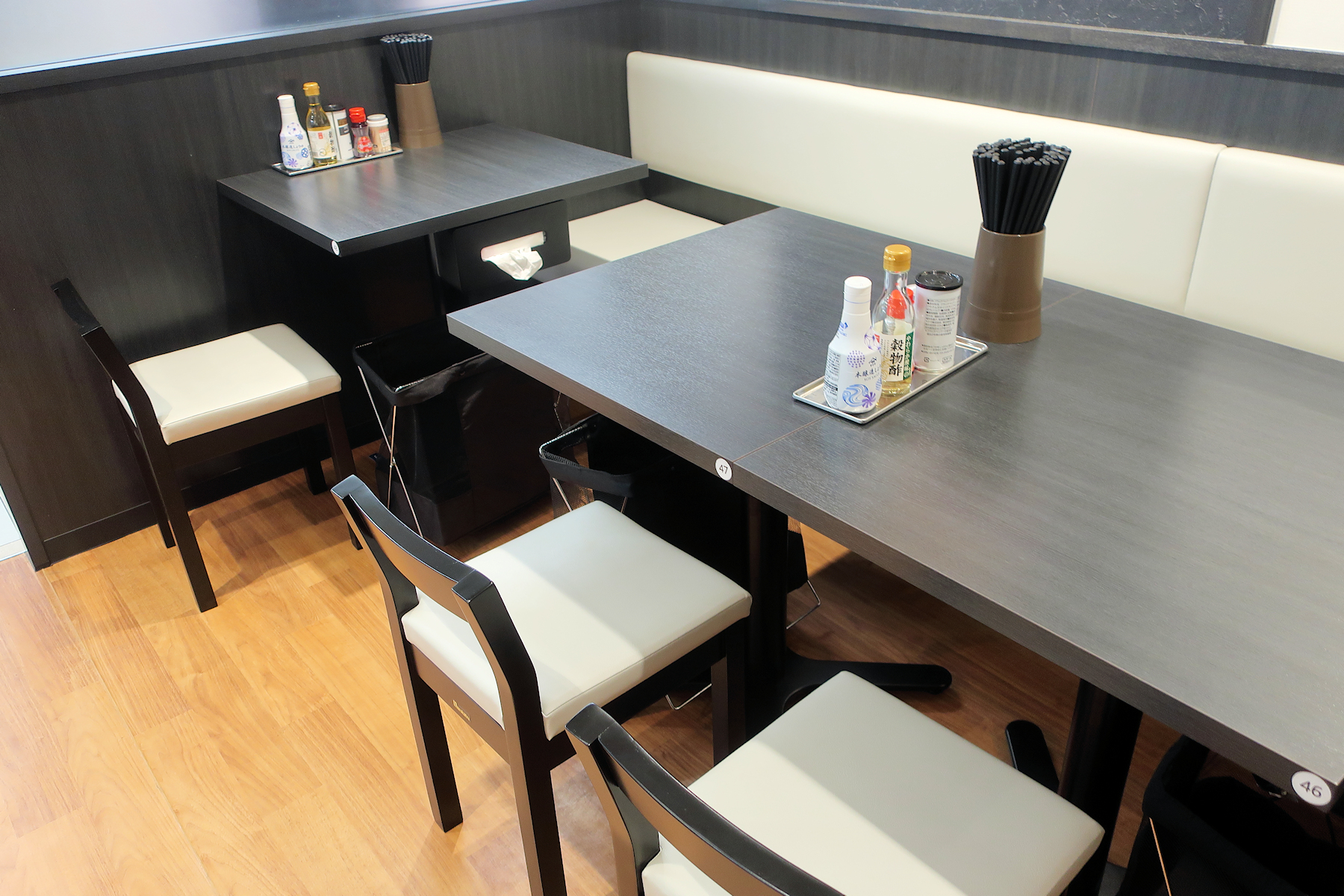 店内は相対カウンター6席、テーブルは2人掛けが4卓、4人掛けが3卓、計26席。