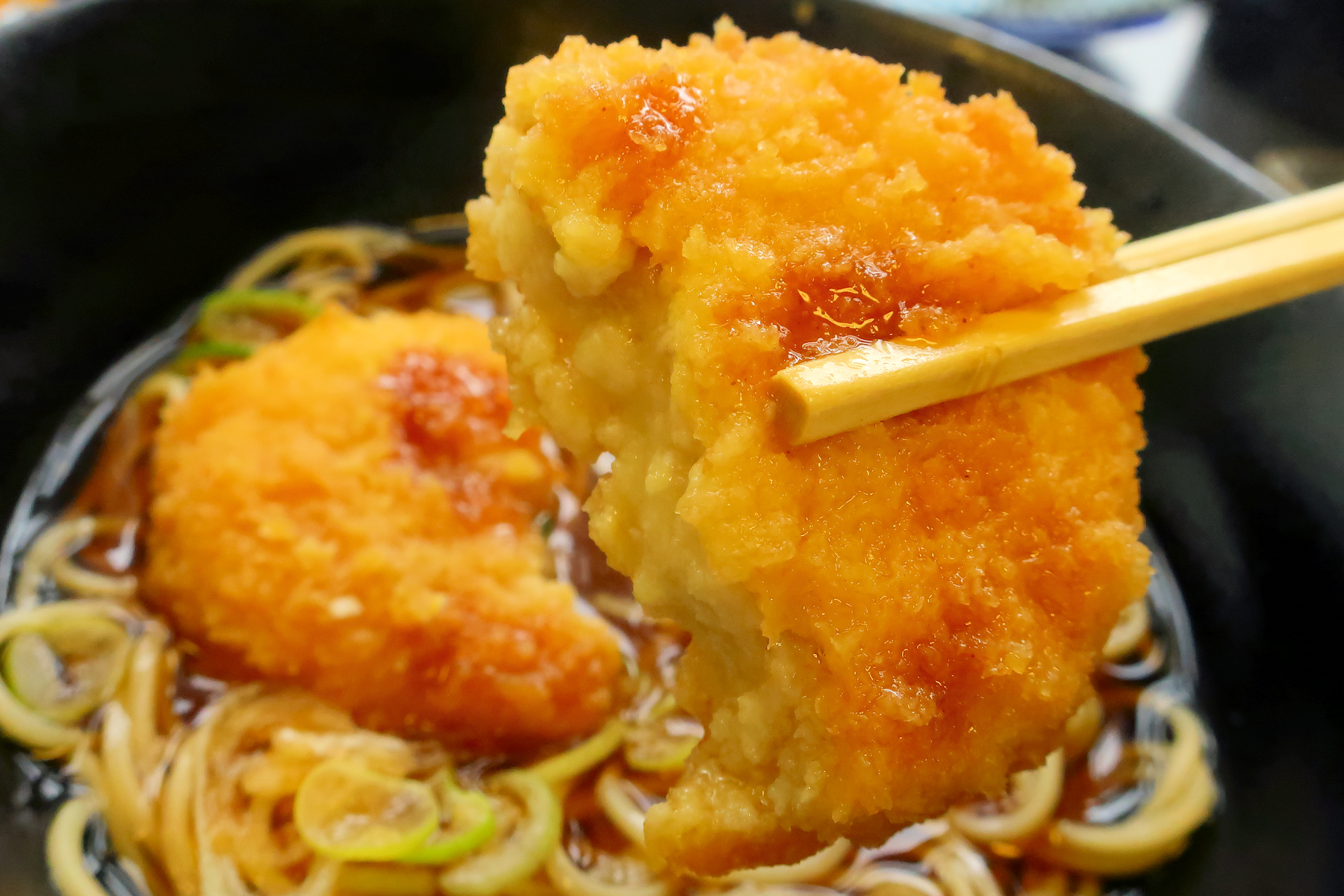 コロッケは単品で食べても美味しいでしょうけど、せっかくなのでかけそばに乗せて頂きます。