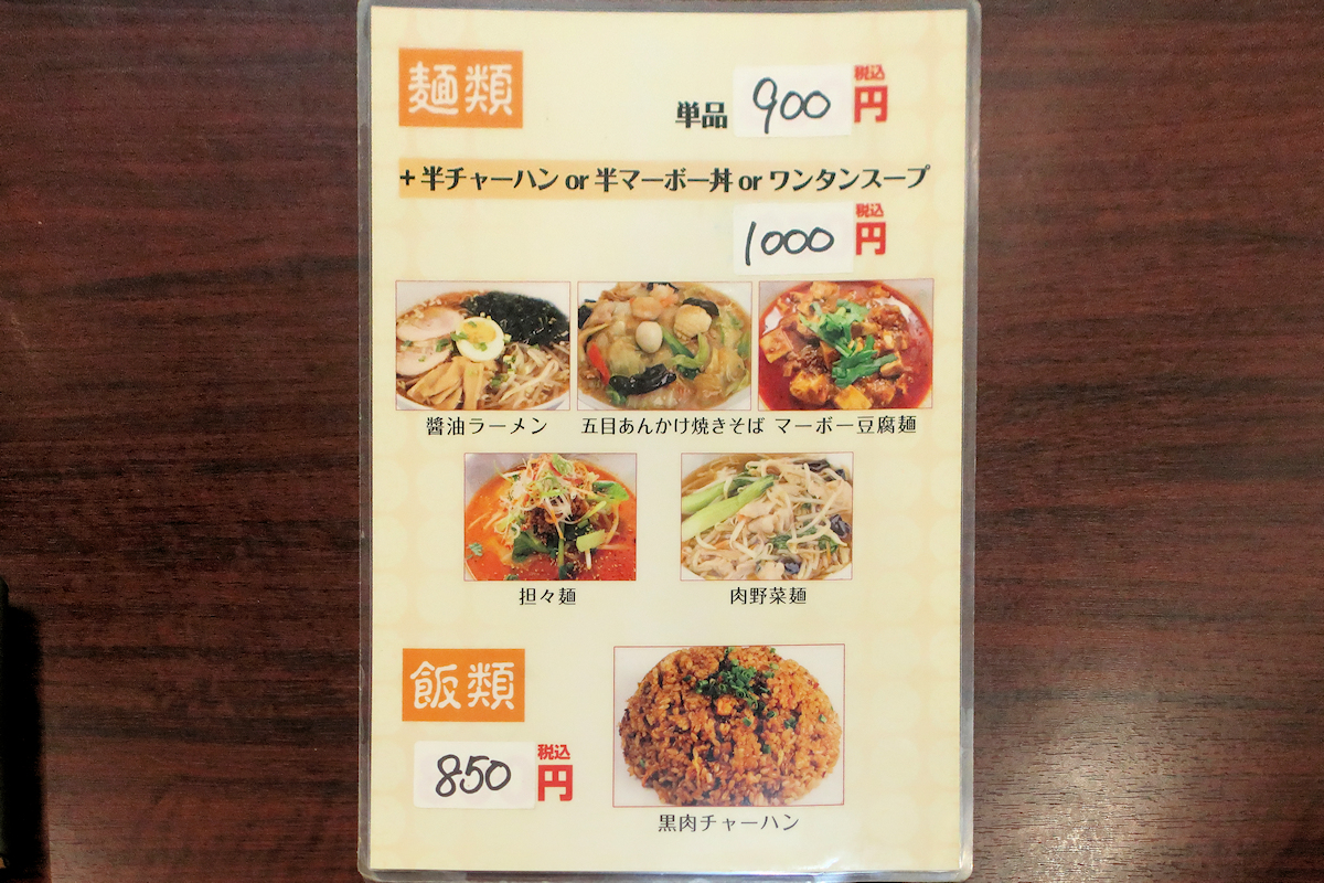 麺類は醤油ラーメン、担々麺、五目あんかけ焼きそば、マーボー豆腐麺、肉野菜麺かいずれも900円。
