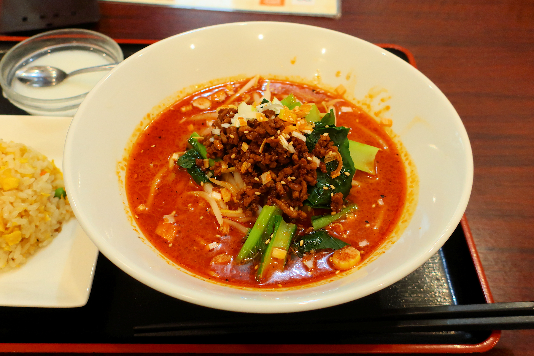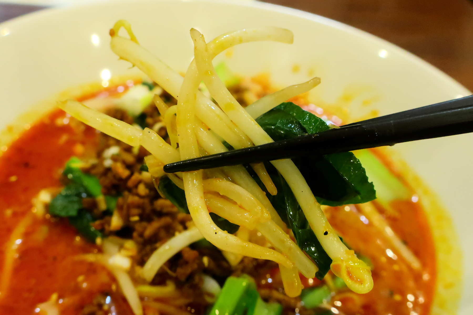 担々麺は辛味を効かせた様なスープに麺を沈め、茹でた青菜ともやしを乗せ、