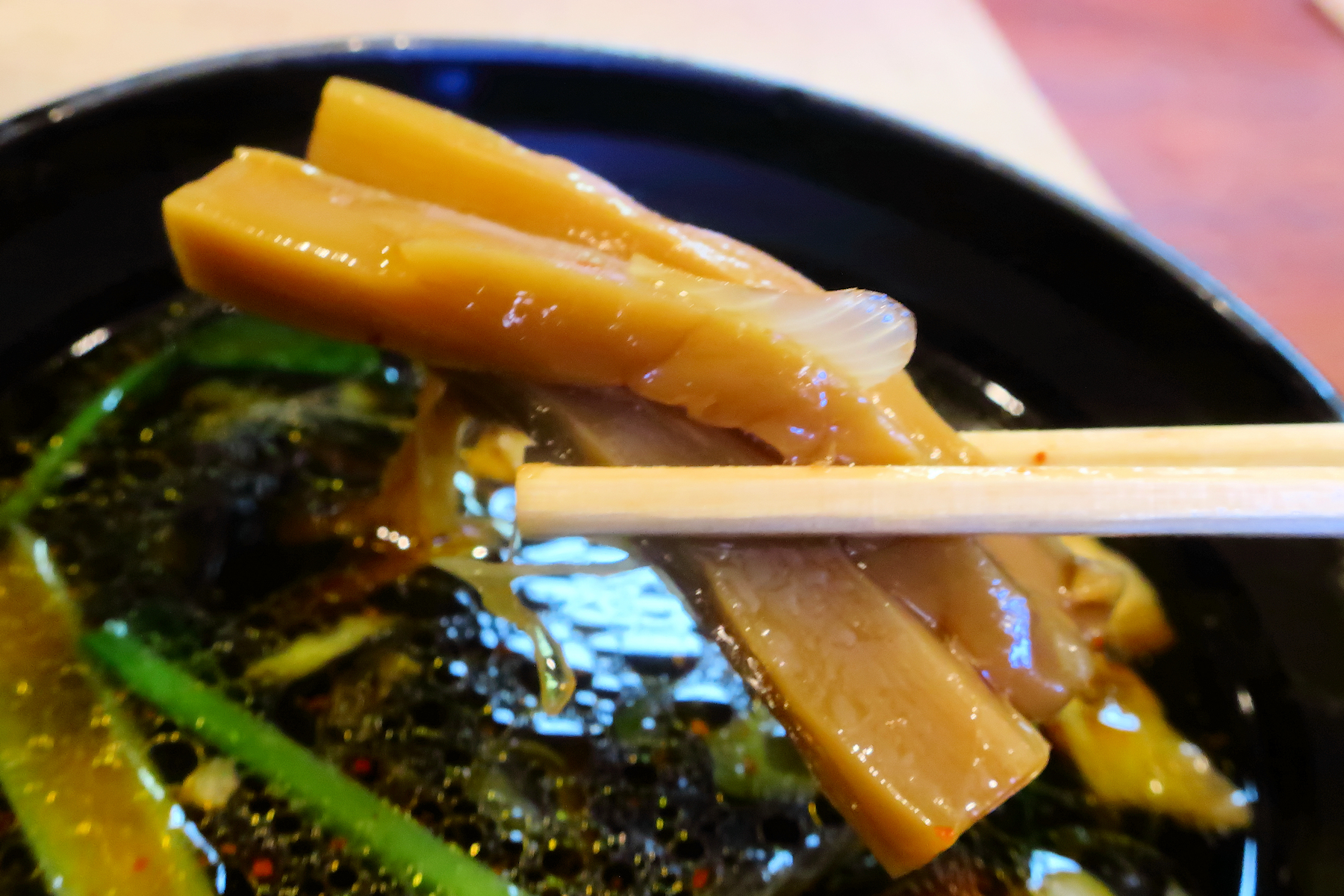 らーめんのそれと異なるやや太めのメンマ。