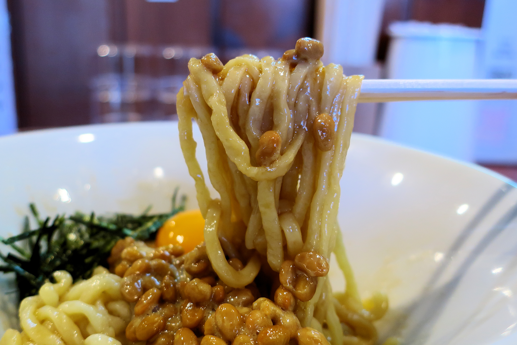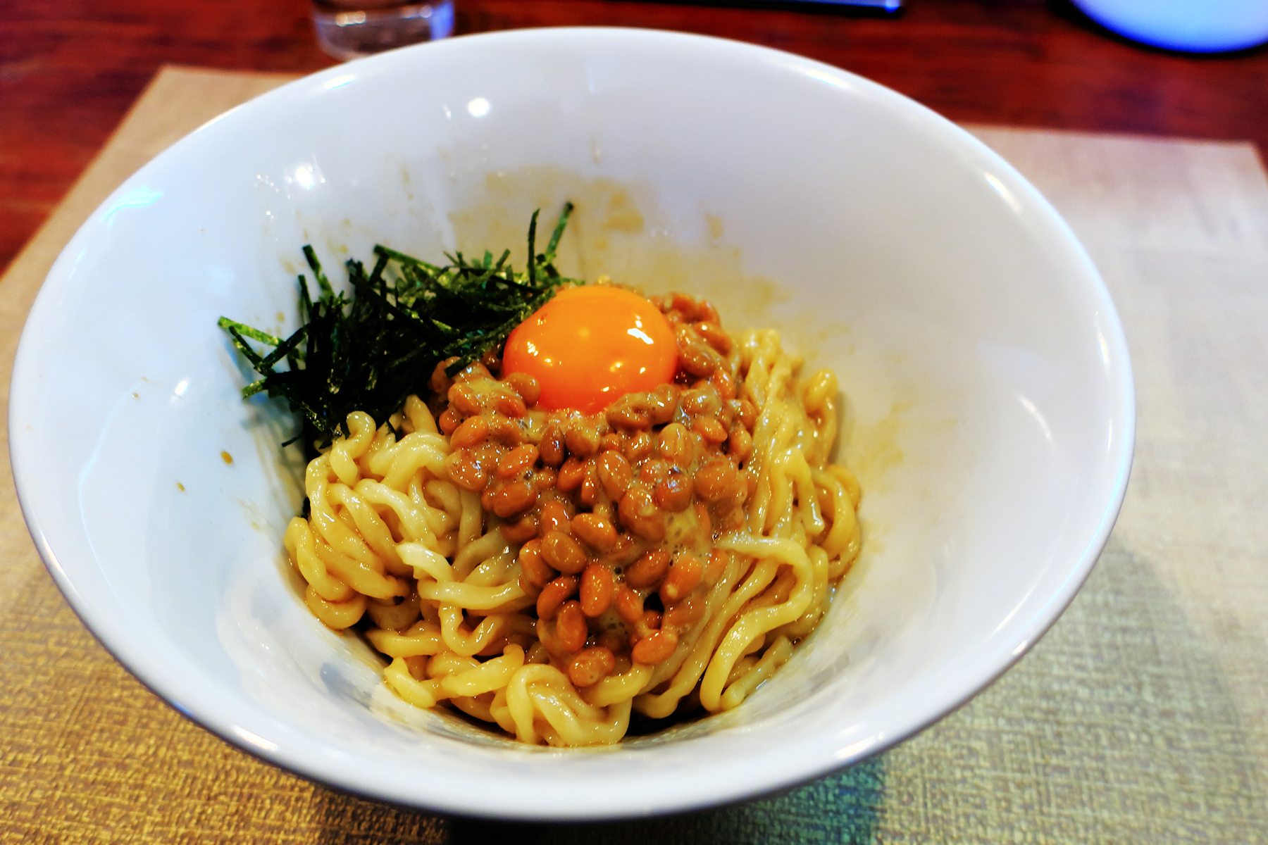 醤油ベースのたれを麺に和えてから、かき混ぜたおかめ納豆、卵黄、刻み海苔が乗せてあります。