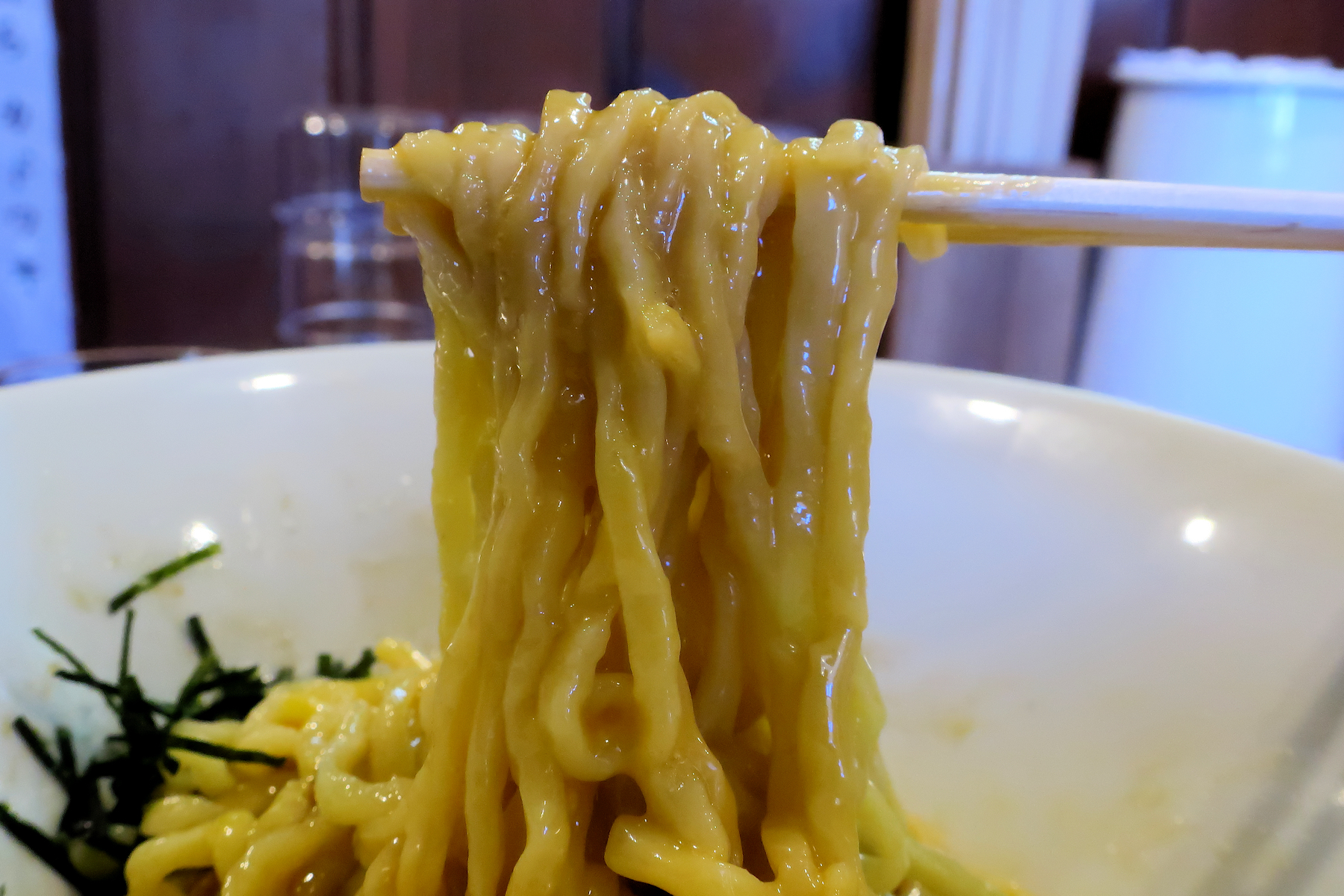 つけ汁には白ネギだけでは無く、細切れにされたチャーシューが沈めてあります。