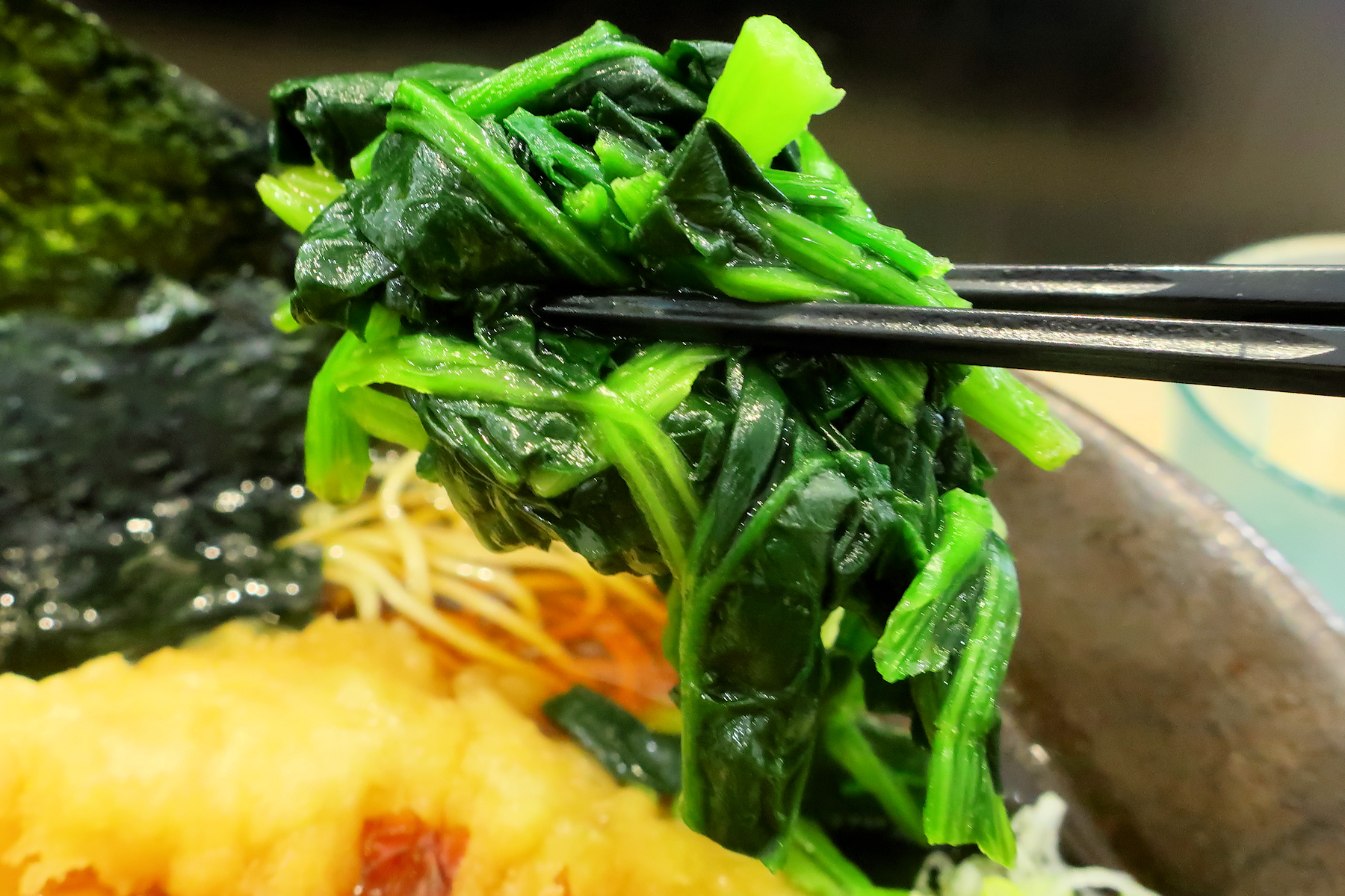 ほうれん草はラーメン店ならば「生ほうれん草」と表記されることもある、店内調理の茹でたてほうれん草。