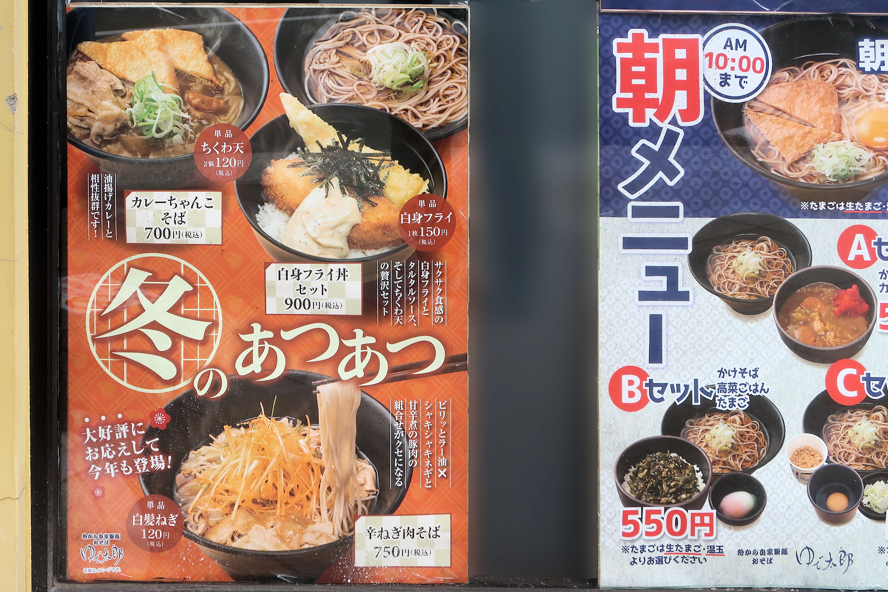 冬限定メニューはカレーちゃんこそば700円、自身フライ丼セット900円、辛ねぎ肉そば750円。